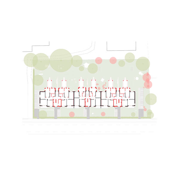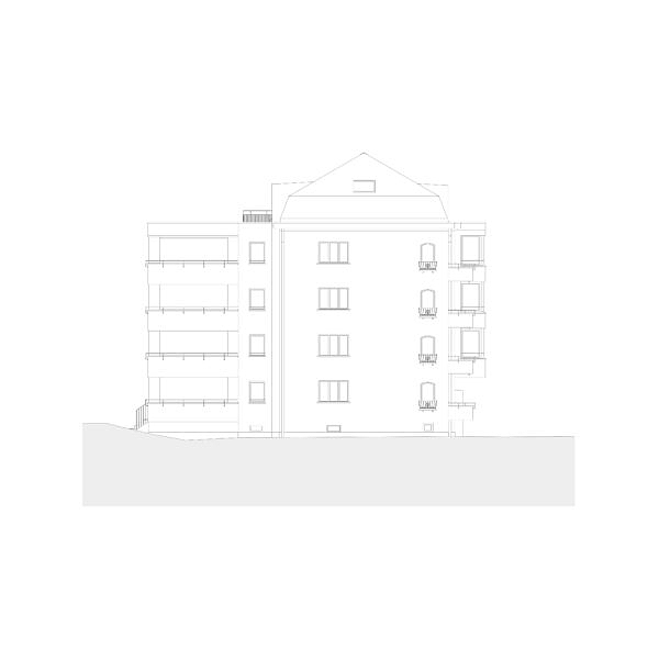 Eine neue Raumschicht in den Garten vergrössert die Wohnungen und deren Aussenräume. Der Ausbau des Daches schafft zusätzlichen Wohnraum. Erker auf der Strassenseite vergrössern die Wohnfläche weiter und markieren die neuen Hauseingänge, welche bisher auf der Gartenseite waren. Ein Lift erschliesst neu alle Geschosse hindernisfrei. Mit dem Projekt erhöhen wir die Hauptnutzfläche um rund 600m². Durch das Verlegen der Hauseingänge und die raumgreifende Erweiterung in den Garten erhalten die Wohnungen eine neue, ausgedehnte Kontaktfläche mit dem gemeinsamen Gartenraum.