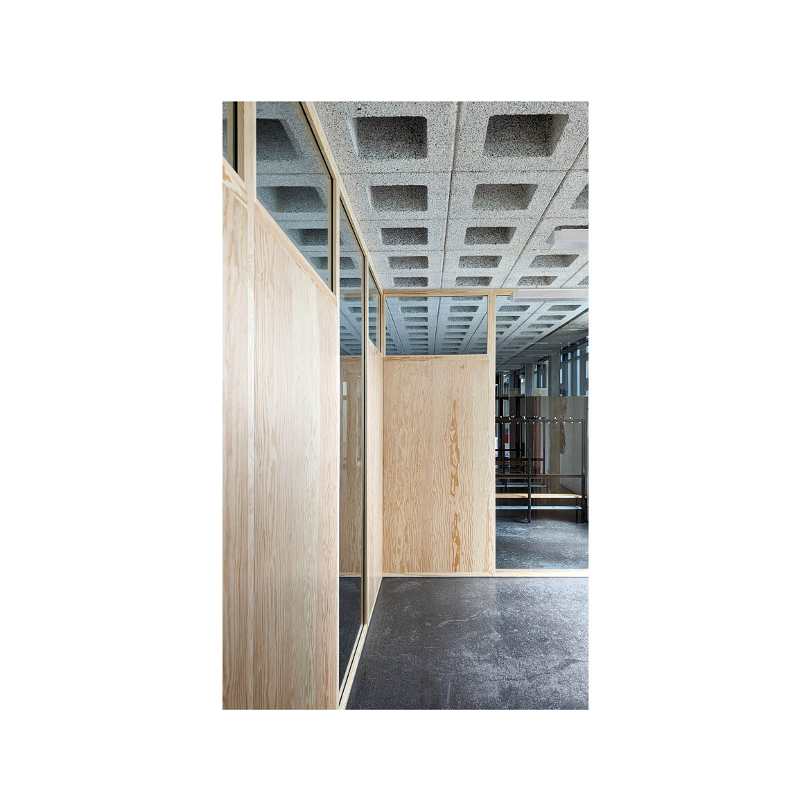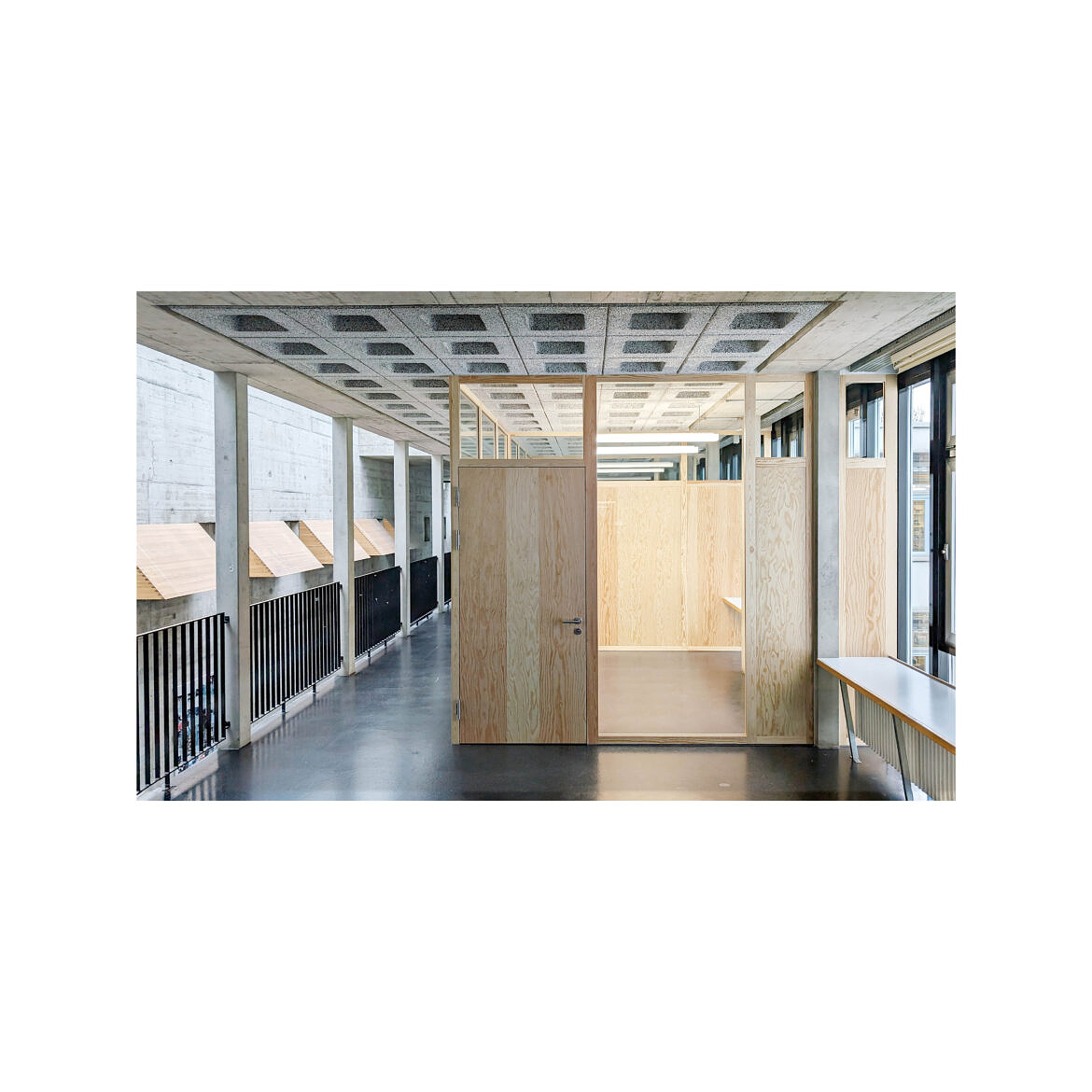 In der Kantonalen Französischsprachigen Schule (ECLF) an der Jupiterstrasse in Bern, Ende der 1980er-Jahre von Somazzi Häfliger Grunder Architekten realisiert, fehlte Platz für den Sonderunterricht mit Kleingruppen. Mit dem Amt für Grundstücke und Gebäude (AGG) als Auftraggeberin und in Absprache mit der Städtischen Denkmalpflege konnten wir in den grosszügigen Korridorzonen des schützenswerten Gebäudes Einbauten mit möglichst geringfügigem Eingriff in die bestehende Substanz realisieren.