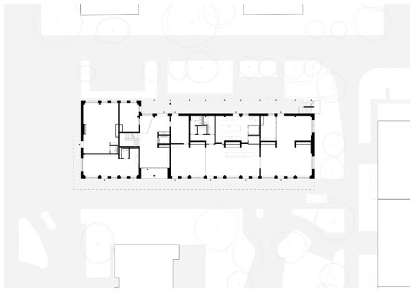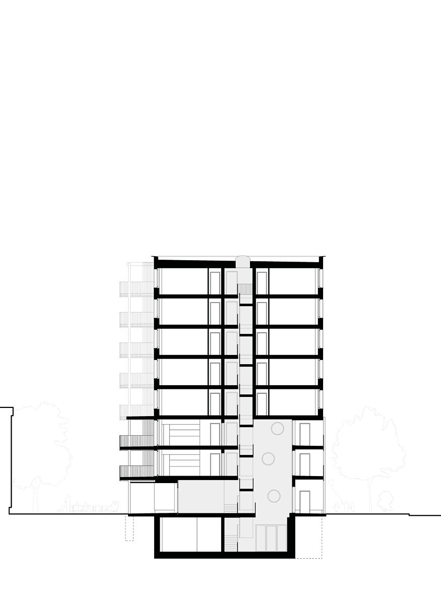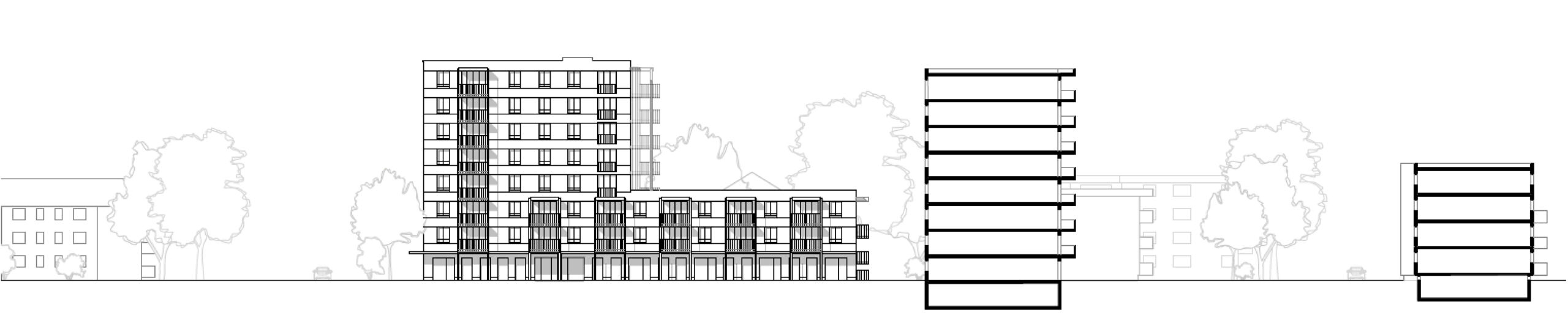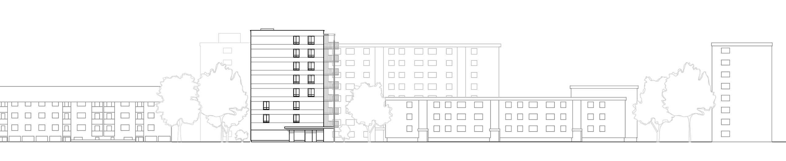 Der achtgeschossige Gebäudeteil an der Pestalozzistrasse markiert den Hauptzugang zur Siedlung, der neu über den Innenhof führt. Wo heute noch Parkplätze sind, entsteht ein neuer Aussenraum für alle. Das Erdgeschoss des Neubaus orientiert sich zum neuen Zugangsweg und zum gemeinsamen Hof. Eine flexible Gewerbefläche befindet sich direkt an der Pestalozzistrasse. Das neue Siedlungs-Bistrot belebt den Hof und kann mit dem angrenzenden Gemeinschaftsraum und der vorgesehenen kleinen Kita kombiniert werden.
