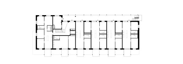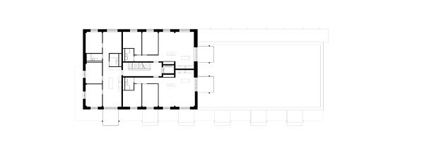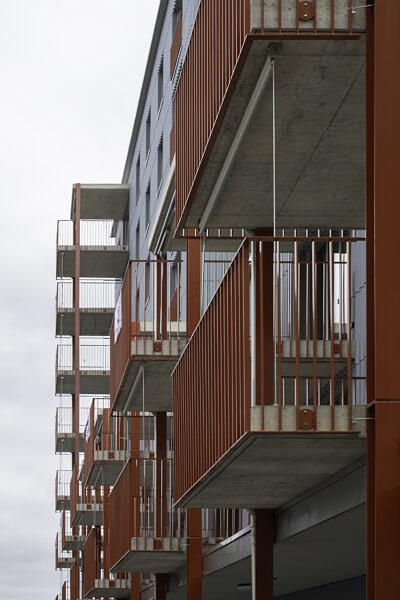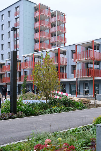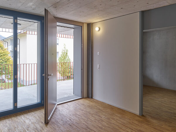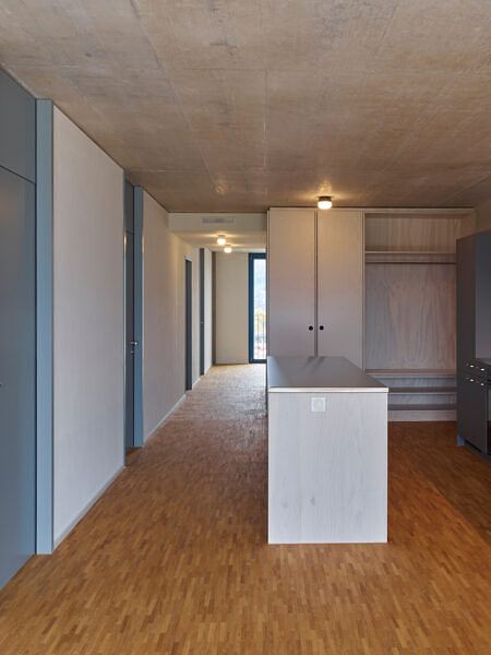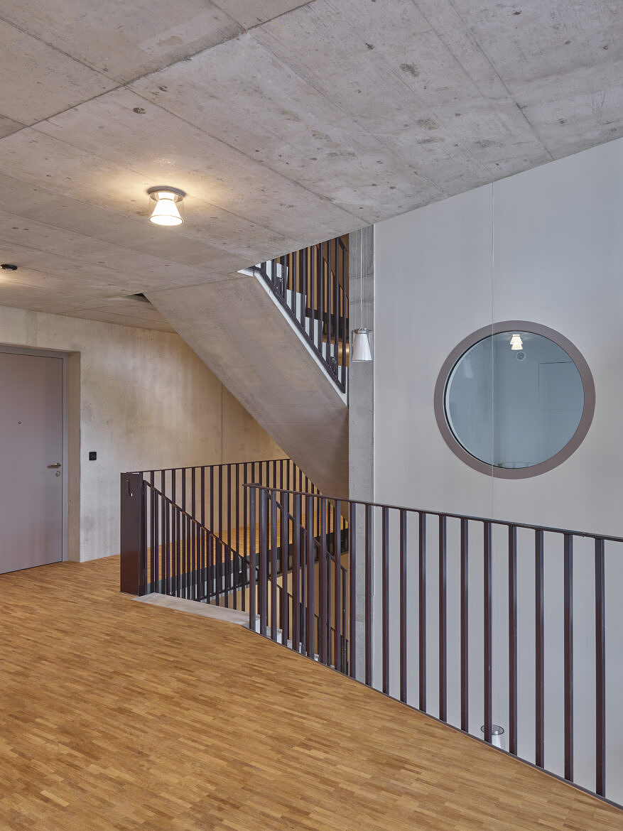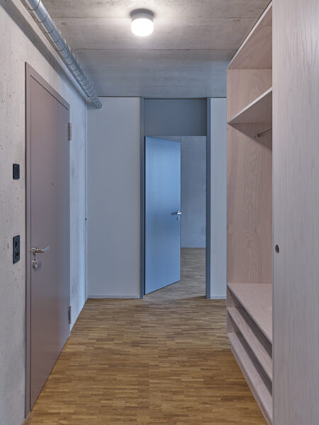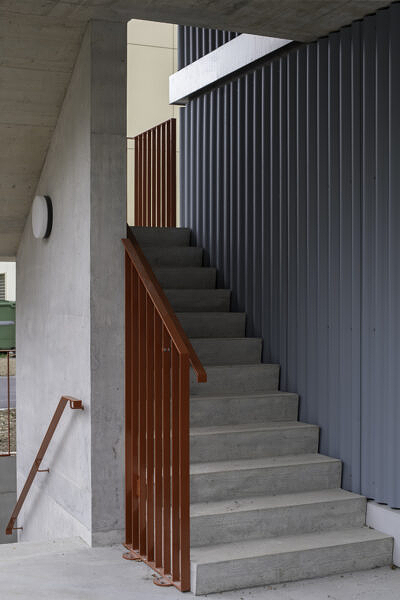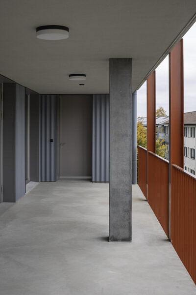 Die Erschliessung der Wohnungen ist ein Hybrid aus Laubengang und Punkterschliessung. Beim dreigeschossigen Gebäudeteil führt auf der Ostseite entlang dem Quartierweg ein Laubengang mit Aussentreppe zu den Wohnungen im 1. und 2. Obergeschoss. Die Wohnungen im achtgeschossigen Kopf werden durch ein Treppenhaus mit Lift erschlossen, welches jeweils auch zum Laubengang führt. Es entsteht eine spannende Erschliessungsfigur, welche im Erdgeschoss hofseitig an den neuen Siedlungszugang und rückseitig an den Quartierweg angebunden ist. Vom Laubengang her sind auch drei Ateliers zugänglich, welche als Joker- oder Ferienzimmer von allen Siedlungsbewohner*innen dazu gemietet werden können.