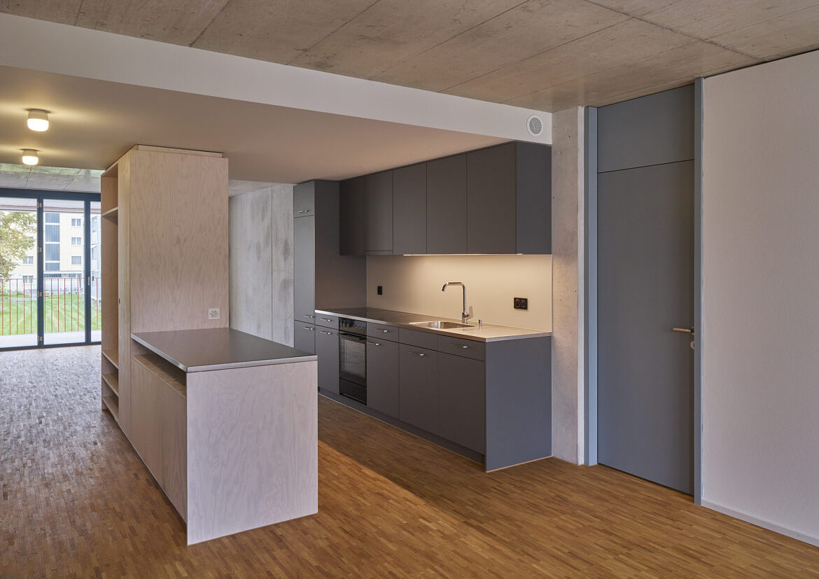 Der Neubau ist in Hybridbauweise erstellt: Betonstützen um einen Betonkern (Erdbebensicherheit) tragen die Betondecken (Schallschutz). Die Fassaden werden mit vorfabrizierten Holzelementen ausgefacht (optimierte Bauzeit) und mit Welleternit verkleidet. Balkone und Laubengang sind als Stahl-/Betonkonstruktion vorgehängt. Die Einfachheit der Konstruktion ist im Materialkonzept erkennbar. Wo Beton verwendet wird, wird dieser sichtbar gezeigt und mit einem einfachen Eichenparkett, abgeriebenen Leichtbauwänden und Einbaumöbel aus Seekiefer kombiniert. Das Gebäude wird im Minergie-P-Standard erstellt und entspricht den Eco-Anforderungen. Ein siedlungseigener Wärmeverbund mit Grundwasser-Wärmepumpe, kombiniert mit PV-Anlagen auf allen Dächern und dem Zusammenschluss zum Eigenverbrauch (ZEV), deckt einen hohen Anteil des Energieverbrauchs der Siedlung mit erneuerbarer Energie ab.