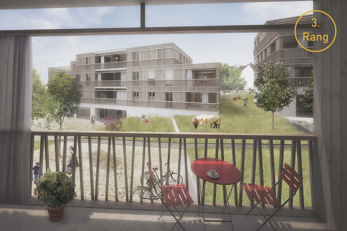 Die Staffelung der Gebäude in der Höhe schafft differenzierte Gebäudevolumen und erlaubt den Wohnungen viel Aus- und Weitblick. In den Sockelgeschossen sind jeweils Gemeinschafts- und Nebenräume angeordnet, im südlichen Baukörper ist im Sockelgeschoss der Betrieb einer Kita vorgesehen. Die Waschküchen sind pro Gebäude direkt vom Laubenraum zugänglich und orientieren sich alle zum Hof hin. Sie sind natürlich belichtet und belüftet und als Ort der Begegnung konzipiert.
