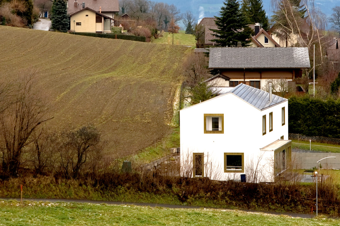 Der Neubau nimmt verschiedene Bezüge aus der Umgebung auf und spielt durch den zur Längsfassade schräg verlaufenden Dachfirst mit den Geometrien der Umgebung und dem Typus Einfamilienhaus. Die markanten Messingzargen der Fenster prägen den Charakter des Baus, der sich in die Situation und Topographie einbindet.