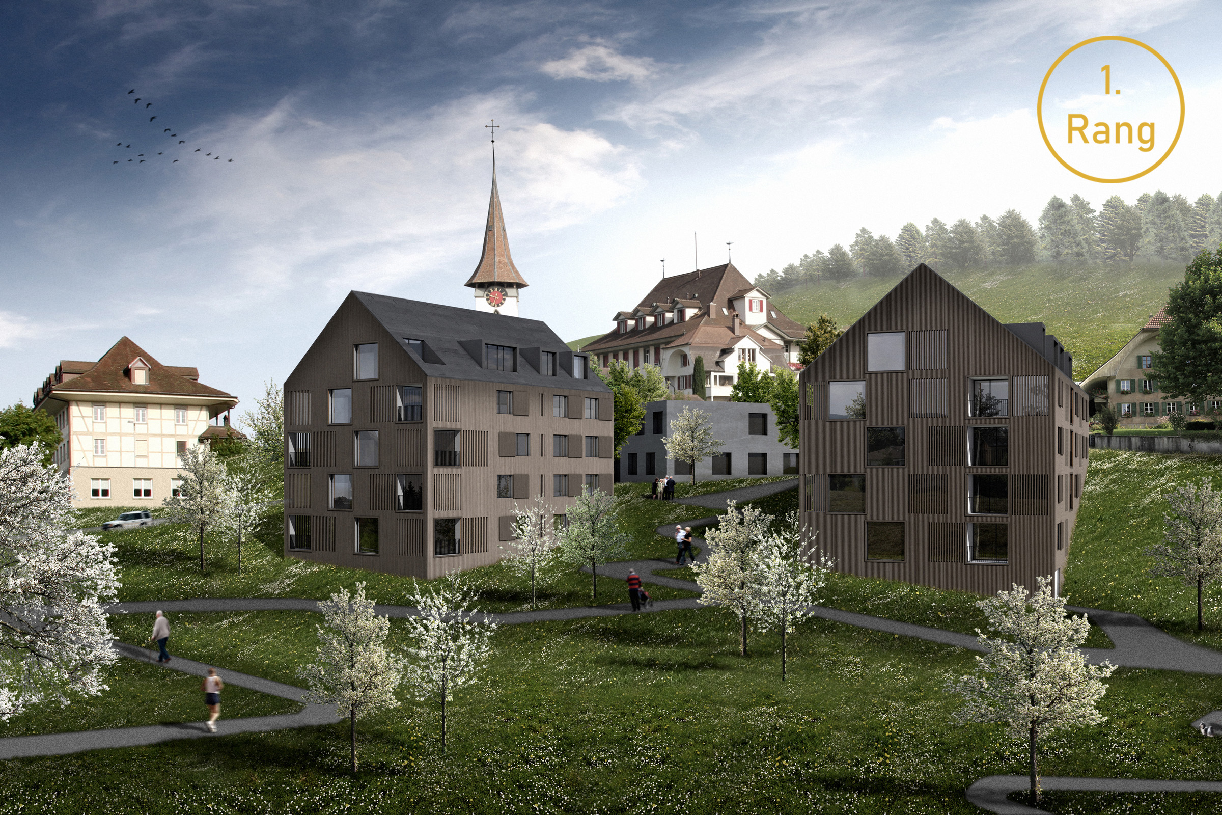Das Zentrum der Anlage wird der Dorfplatz, welcher sich zwischen der Kirche und dem Restaurant Bären sowie dem neuen Verwaltungsgebäude aufspannt. Die Offenheit schafft einen Treffpunkt für Bewohner und Dorfbevölkerung. Ein Wiesenteppich überzieht das Areal bis zu den Wohngebäuden und bettet diese in der Landschaft ein. Locker gestreute Zierobstbäumen schaffen einen behutsamen Übergang zwischen Kulturlandschaft und Siedlung. Die Geschossdecken, Treppenläufe und Wohnungstrennwände werden in Ortbeton ausgeführt. Die Fassaden und das Dach werden in Holzbauweise erstellt und über den massiven Kern gestülpt. Die Fassadenhaut ist als vertikale Holzschalung aus sägeroher Lärche vorgesehen. Beschattung der Fenster erfolgt teils über hölzerne Schiebeläden, teils werden Stoffmarkisen eingesetzt.