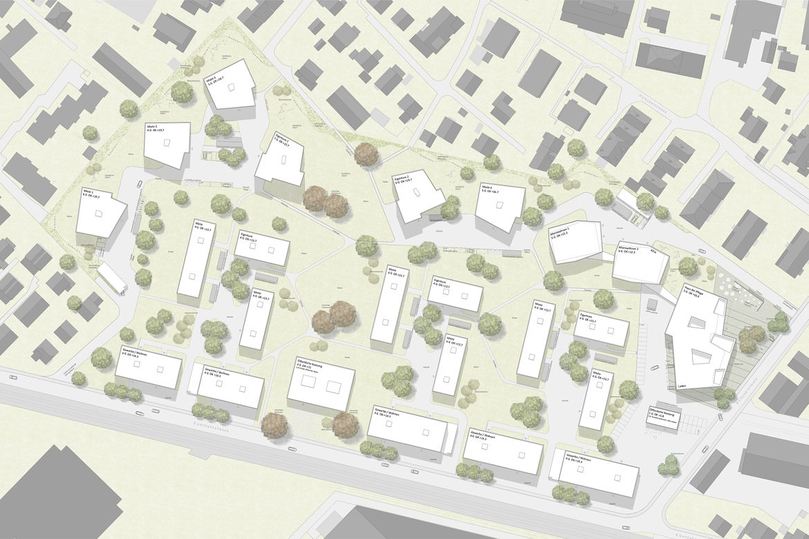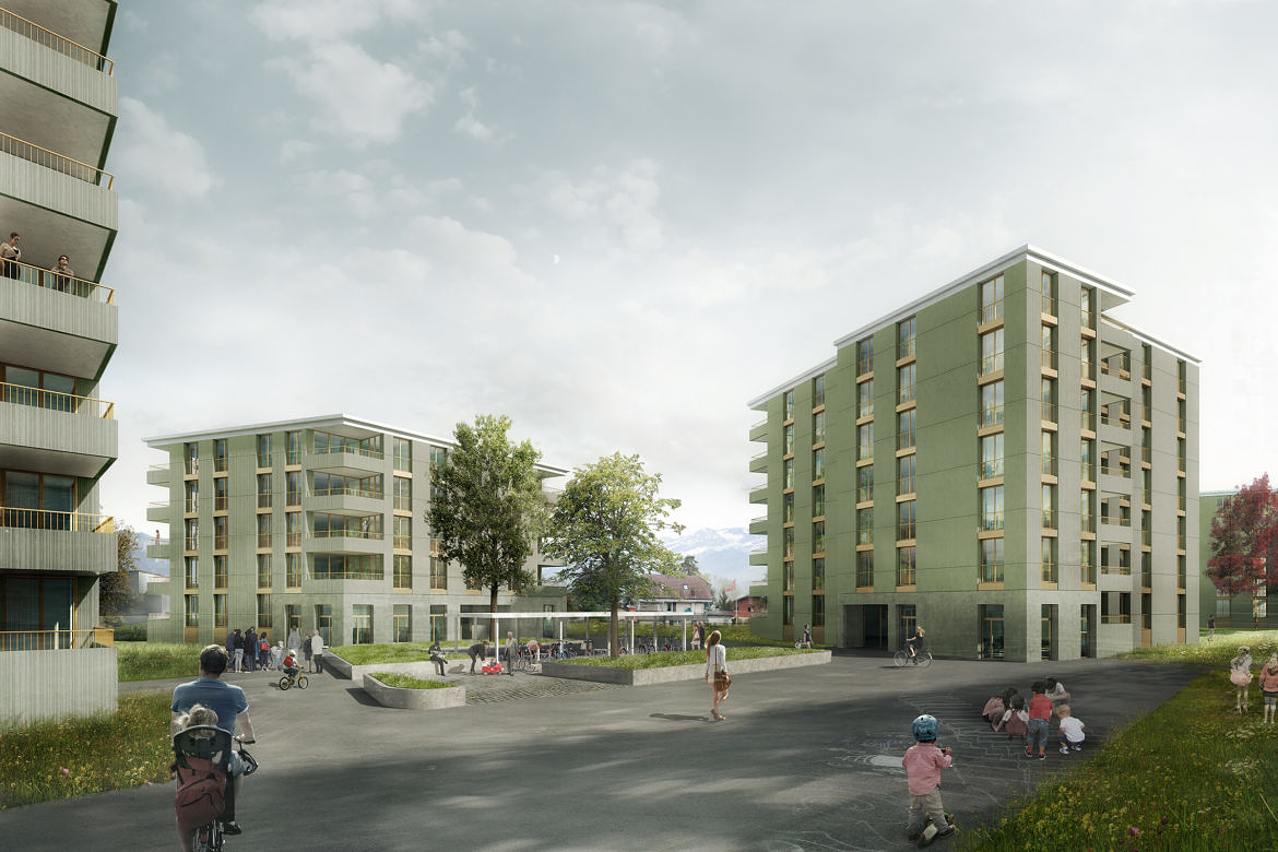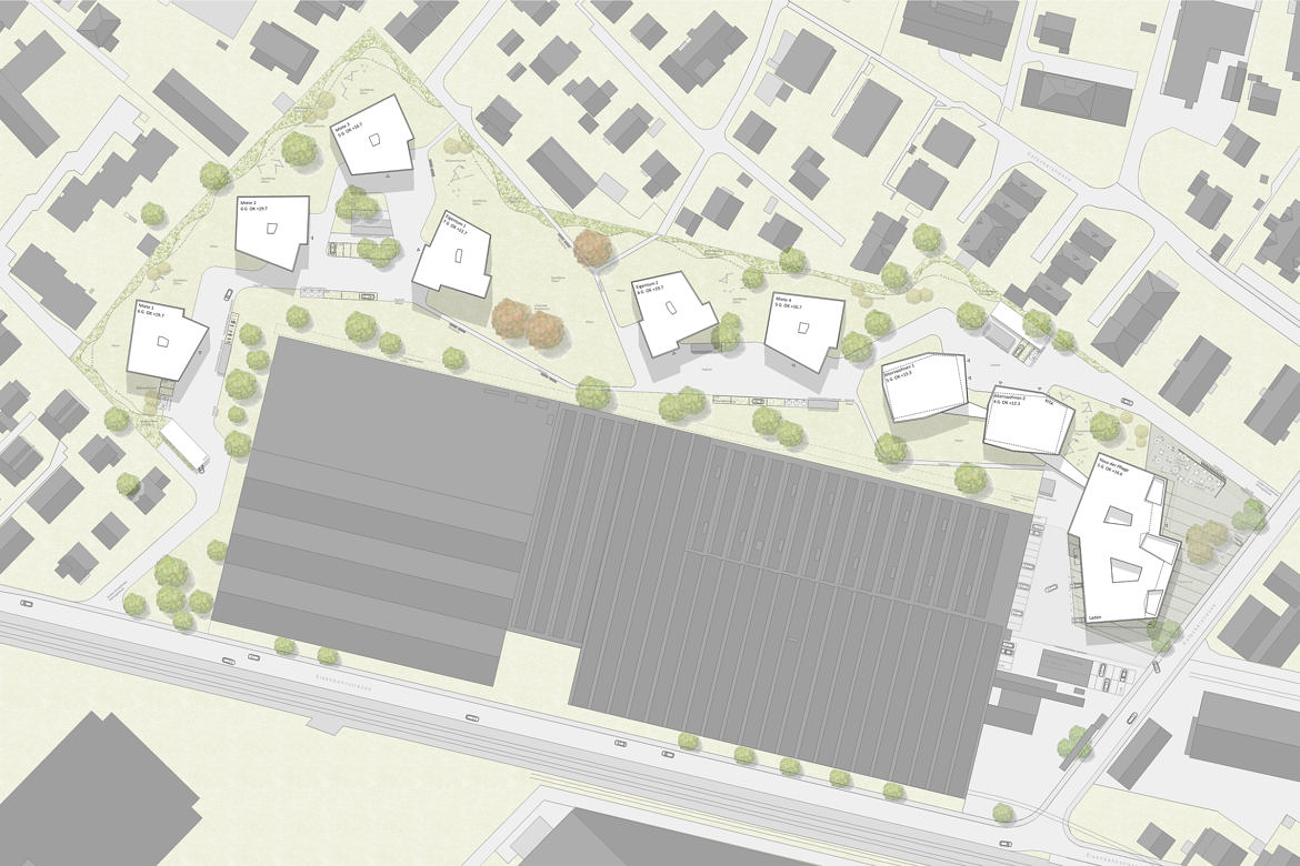 Wesentliche Punkte für die Entwicklung des städtebaulichen Themas sind der charakteristische, langgezogene Grünraum entlang der Industriehallen sowie die Präsenz der Bergkulisse. Ausgehend von der Lektüre des Ortes entwickelt sich ein neuer Siedlungskörper bis an die Eisenbahnstrasse. Dabei legt sich der Aussenraum zwischen die unterschiedlichen Gebäude und schafft ein differenziertes, sozialräumlich gegliedertes Freiraumgefüge. Der Idee einer maximalen Durchlässigkeit folgend, ist der Aussenraum durchgehend öffentlich gestaltet. Die Identität wird mit einer hohen Dichte und weitläufigen Aussenräumen geschaffen. Zwei Gebäudetypen, für Eigentum- und Mietwohnungen, erzeugen mit ihrer Stellung und der differenzierten Gebäudehöhe klar adressierte Bauten. Ihre städtebauliche Ausrichtung reflektiert die spezifische Lage, indem jede Wohnung Ausblick an die Bergkulisse oder den See sowie in den Park besitzt.