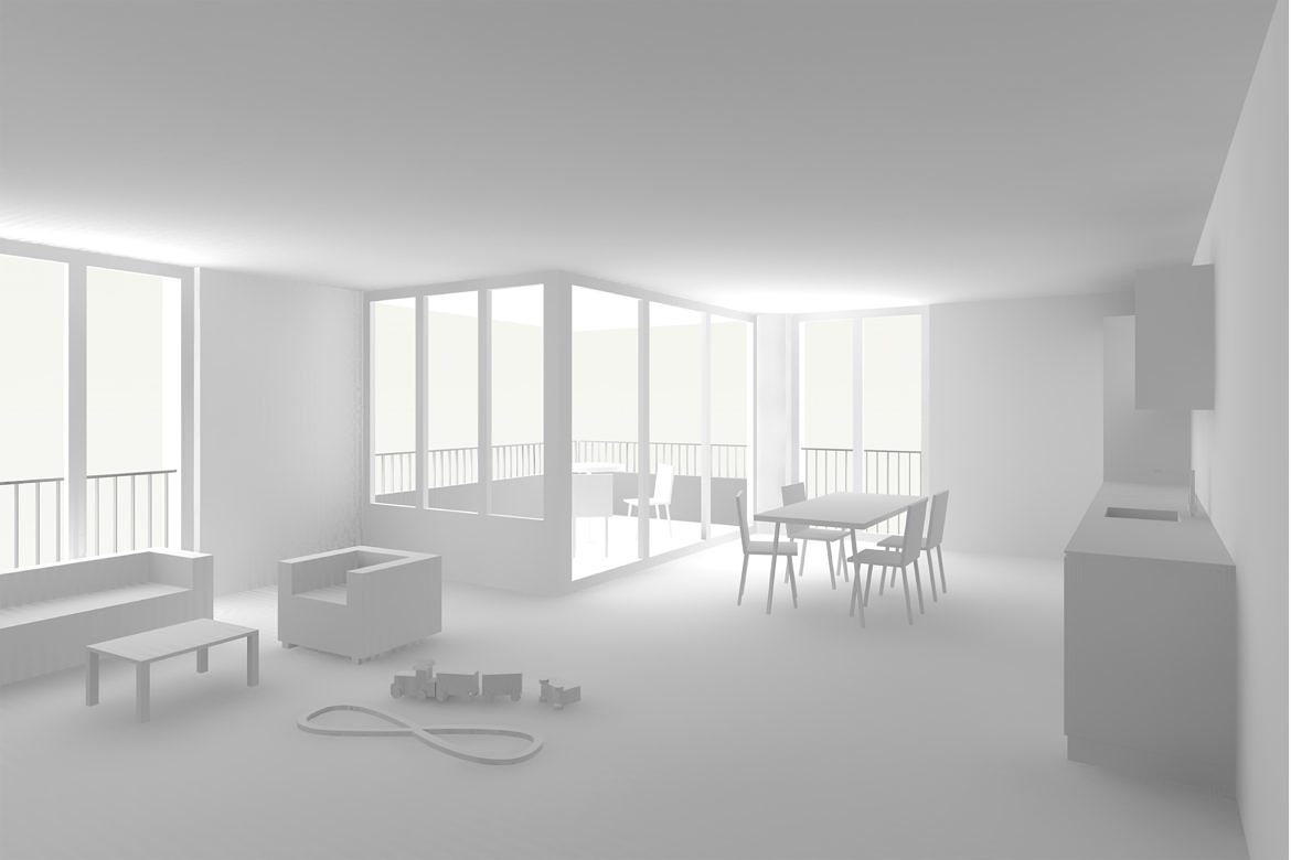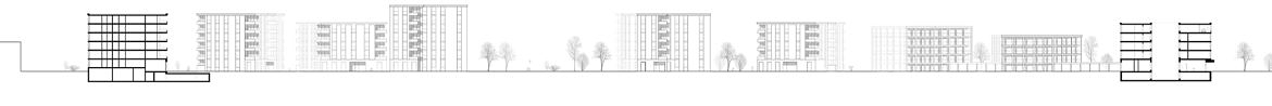 Es entstehen weder Vorder- noch Rückseiten, die Gebäude werden rundum gelesen. Der Charakter und das Thema der einzelnen Bauten bleiben gleich und erzeugen eine eigenständige Identität innerhalb der Siedlung. Entsprechend der städtebaulichen Idee entwickeln die Baukörper der weiteren Etappe ihre logische Gesetzmässigkeit und erzeugen mit ihrem Ausdruck in Präsenz und Schärfe einen klaren Abschluss des Siedlungskörpers zur Eisenbahnstrasse. Die regelmässig rhythmisierten Volumencluster verschaffen sich ihre eigene Identität und halten gleichzeitig grosse Durchblicke offen. Die rechteckig geschnittenen Volumen definieren den Grünraum und schaffen plastische innere Freiräume, welche als öffentliche Begegnungszonen für das soziale Leben, als Gefäss für Spiel, Treffen und Feste, durch die Bewohner differenziert angeeignet werden.
