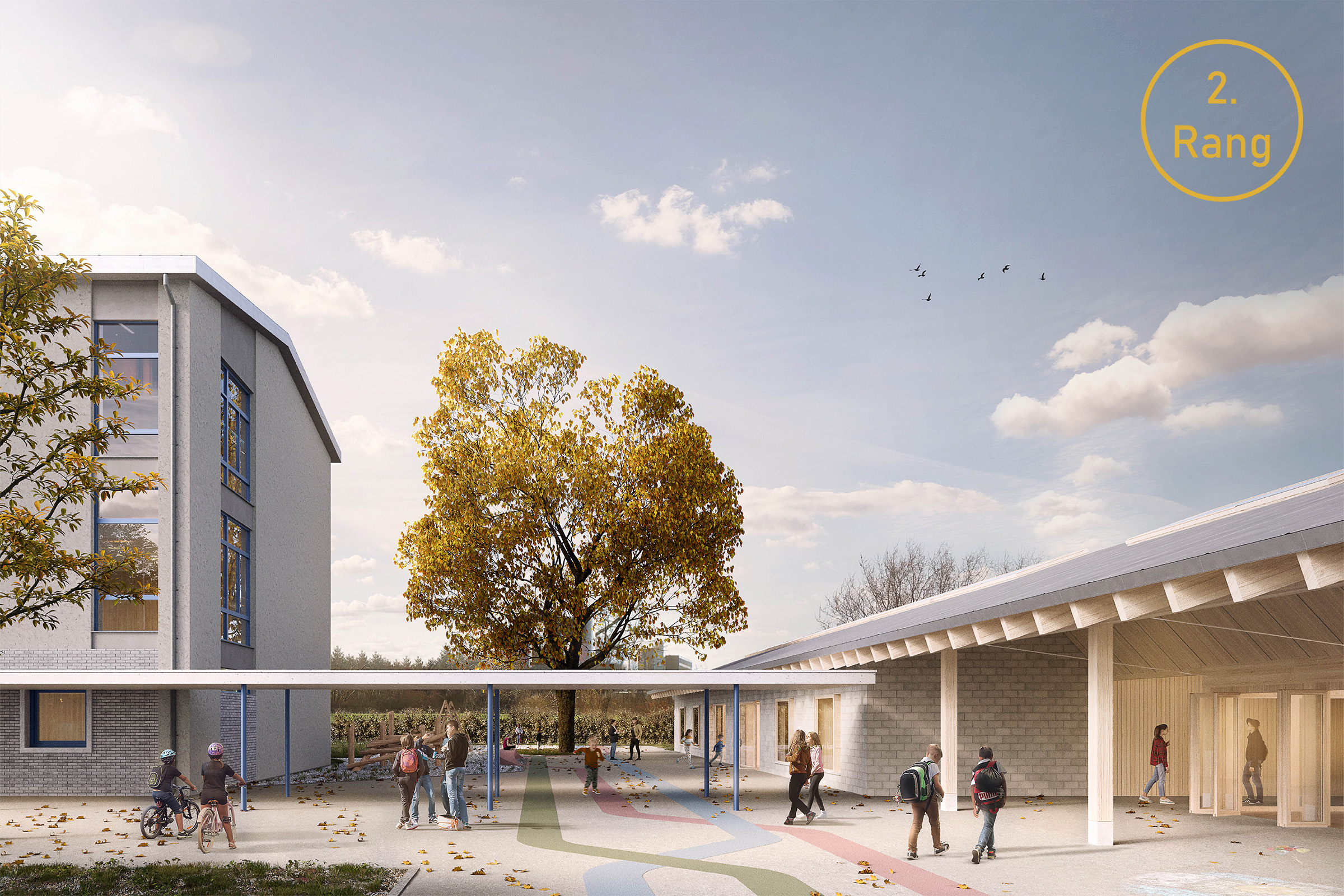 Unter dem neuen Dach erhalten die beiden unterschiedlichen Nutzungen ein eigenes Volumen. Zwischen den beiden Volumen entsteht ein Durchgang, der den Pausenplatz mit dem Wald und den Kindergartenaussenräumen verbindet. Die Lage des Neubaus ermöglicht eine klare Orientierung des Mehrzweckraums auf dem Pausenplatz. Am Rand vom Pausenplatz, nach der neuen gedeckten Verbindung, erhält der Kindergarten eine eigenständige Adresse.