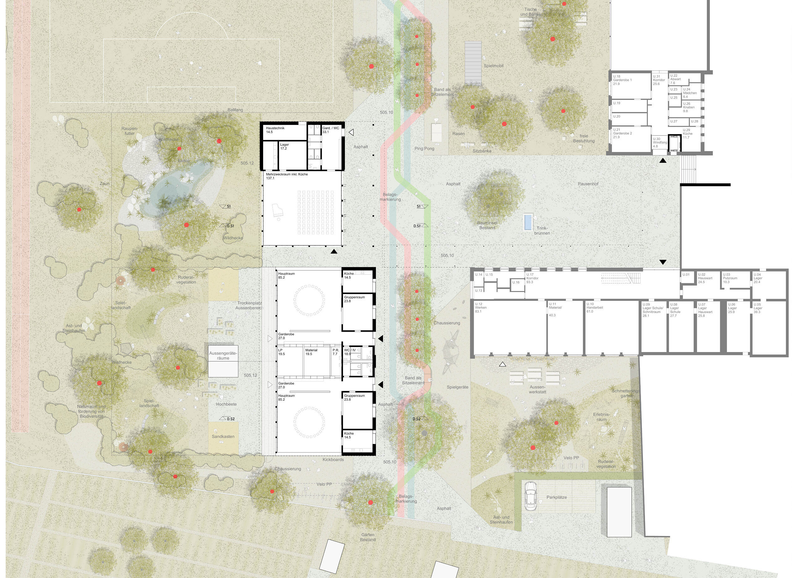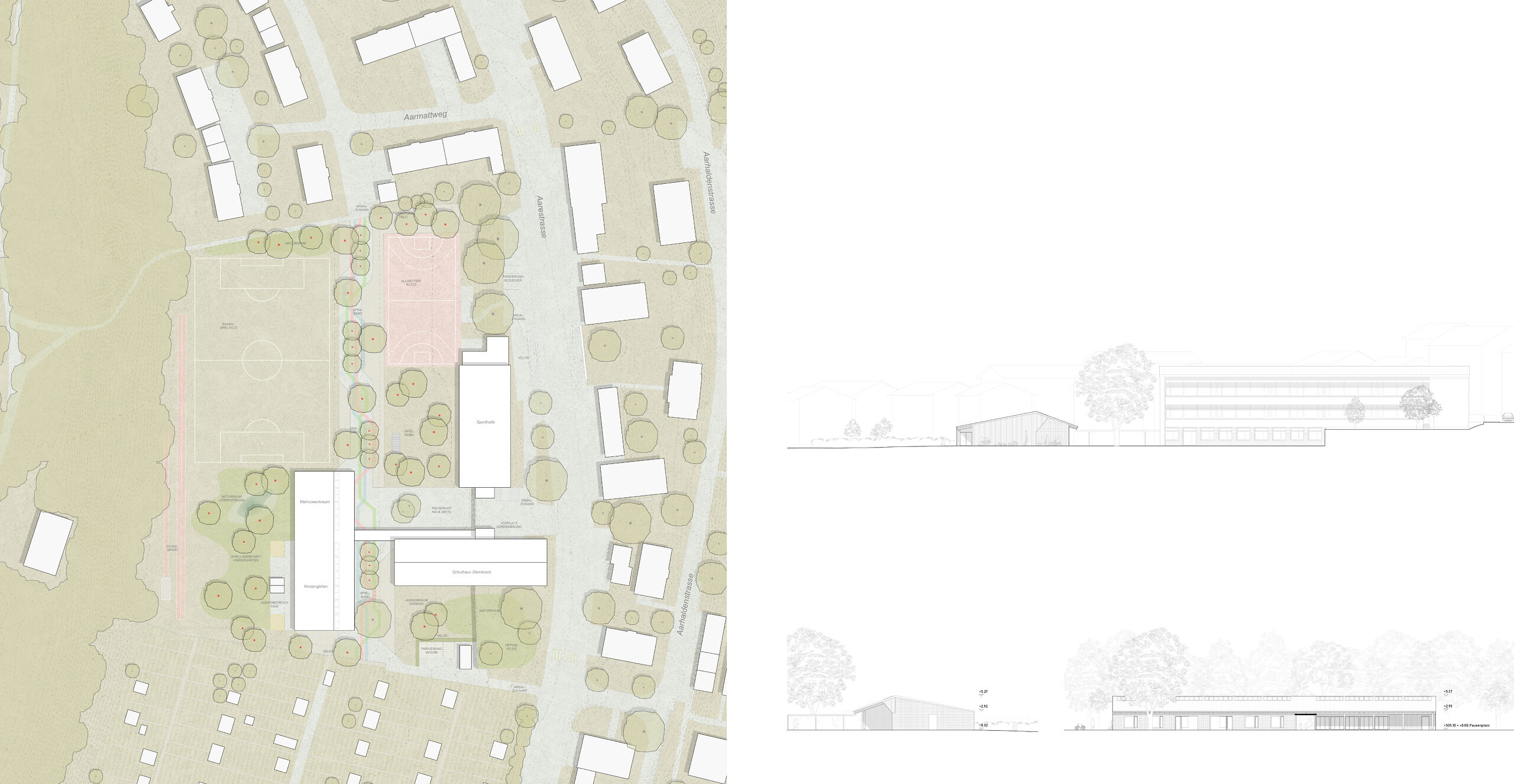 Als strukturierendes Element des Aussenraums wird eine Achse eingeführt, welche das Areal erschliesst, Freiraum sichert und zukünftige Entwicklungen ordnet. Der Hartplatz vor der Turnhalle wird zurückgebaut und als bespielbarer Kräuterrasen ausgebildet. Der Allwetterplatz kann bestehen bleiben, das Rasenspielfeld erhält eine sinnvolle Proportion. Die prächtigen Gehölze an der Aarestrasse, die grosse Esche und die Tulpenbäume werden in das Projekt integriert und mit neuen, trockenresistenten Schattenbäumen ergänzt. Zwischen Neubau und Aarewald entsteht ein Spielraum für die Kindergartenkinder. Der Grünraum mit seinen Kleinstrukturen ist auch abwechslungsreicher Rückzugsort, vielseitiger Naturerlebnisraum und wertvoller Lebensraum für Kleintiere und Pflanzen. Ruderale Flächen wechseln sich ab mit einem Feuchtstandort, wo das Dachwasser des Neubaus versickert.