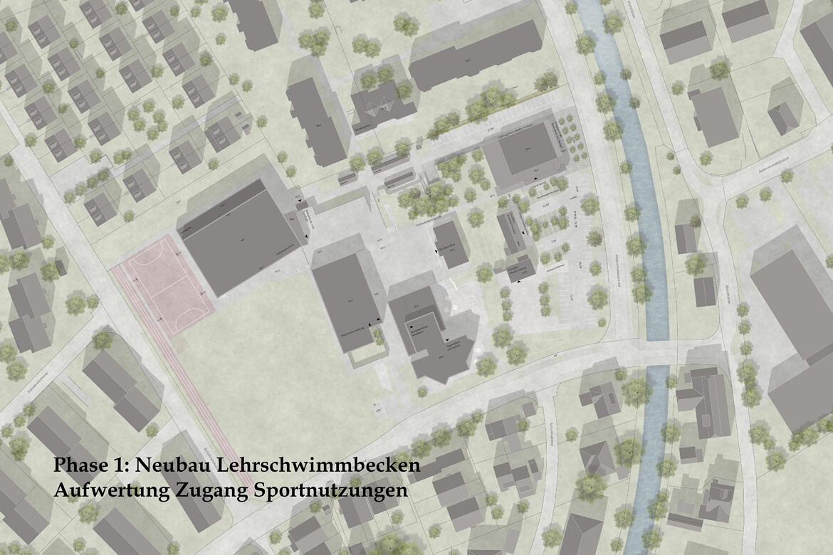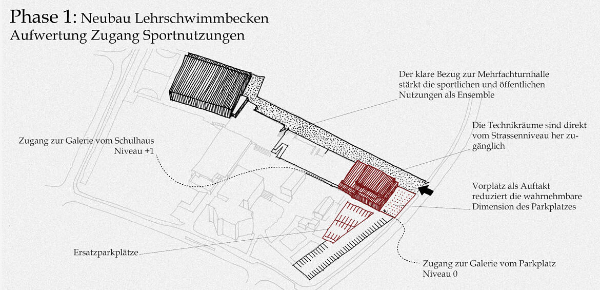 Das neue Lehrschwimmbecken nimmt mit seiner Setzung und im Ausdruck Bezug auf die Mehrfachturnhalle. So werden die zwei, auch öffentlich genutzten Sportanlagen zu einem lesbaren Ensemble mit einer klaren Zugangsachse zusammengefasst. Die Fassade wird mit einer vertikalen dunklen und durchgehenden Holzschalung verkleidet.
