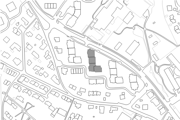 Die abgetreppte Gebäudevolumetrie bietet vielfältige Dachterrassenlandschaften und ermöglicht mehreren Wohnungen einen grossen Aussenraum. Der Zugang zu den Hauseingängen ist heute eher unattraktiv und unübersichtlich. Der gedeckte Vorbereich verbindet zwar alle vier Eingänge miteinander und trägt so zur Identifikation und zum sozialen Austausch der Bewohner bei. Er wirkt aber dunkel, unruhig und hat keine Aufenthaltsqualität. Für den Besucher ist das Erschliessungskonzept mit den vier Eingängen nicht klar erkennbar.