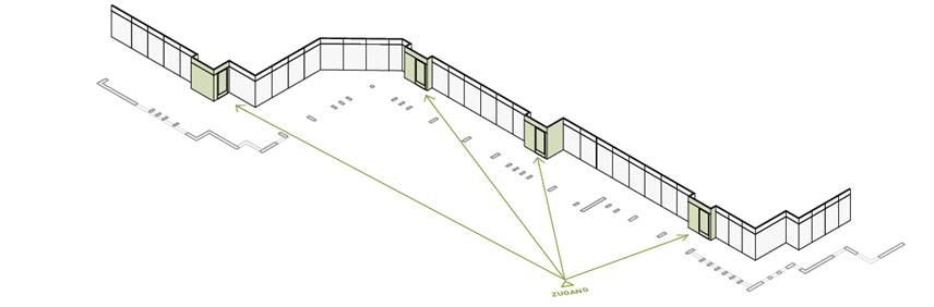 Die Grundfarbe Grün des Bestands wird auch nach der Sanierung das Fassadenprägende Element sein. Die moosgrünen GFK-Gitterroste bei den Balkongeländern bilden eine Referenz an die ursprünglichen Stahlgitter, welche aus Sicherheitsgründen ersetzt werden mussten.