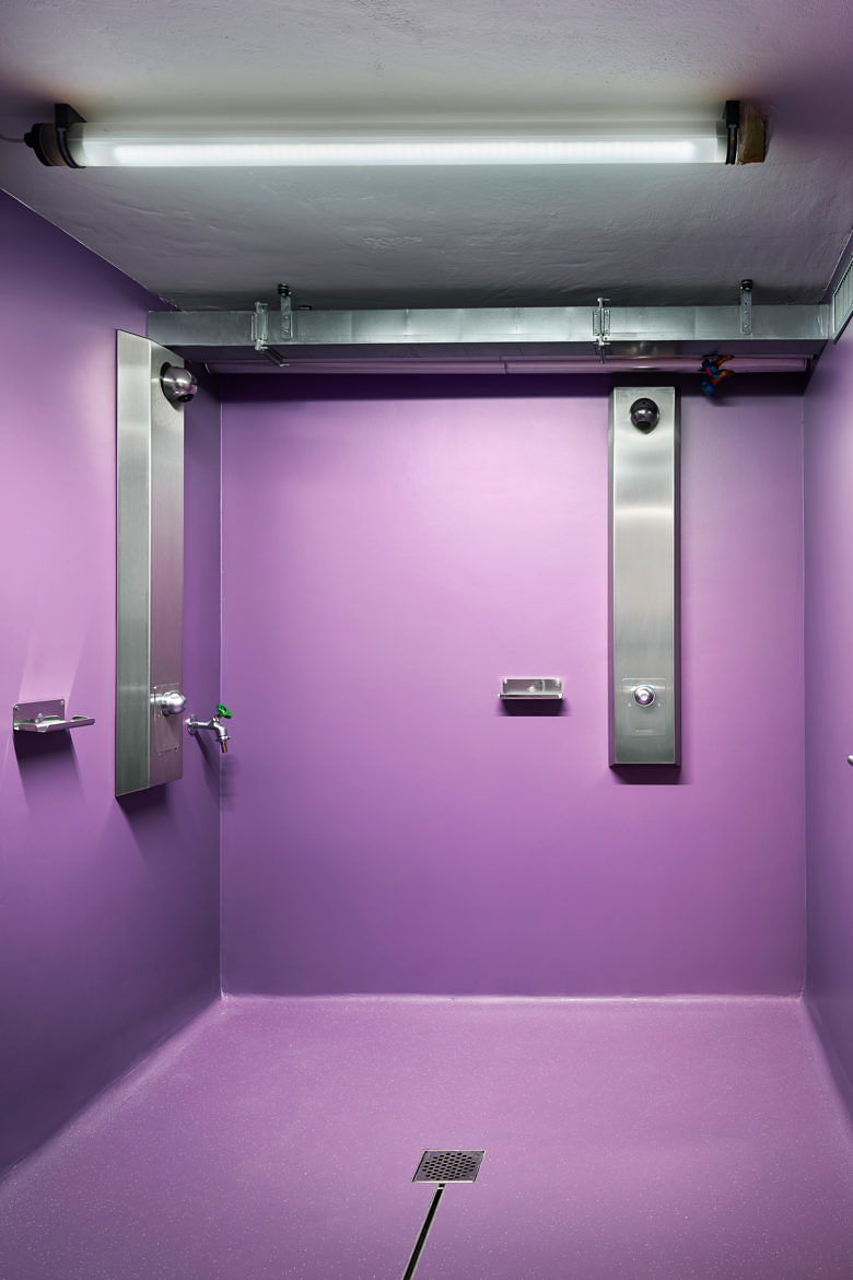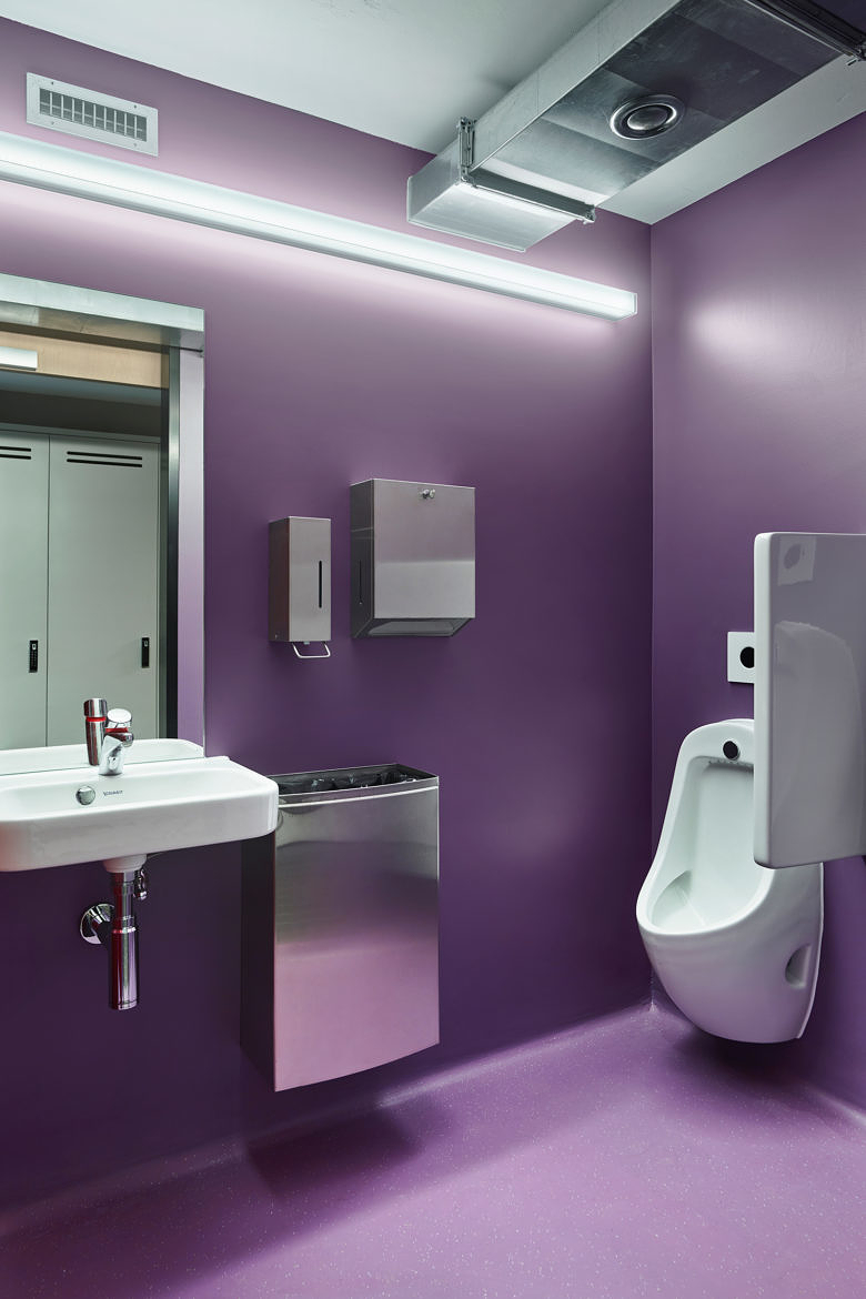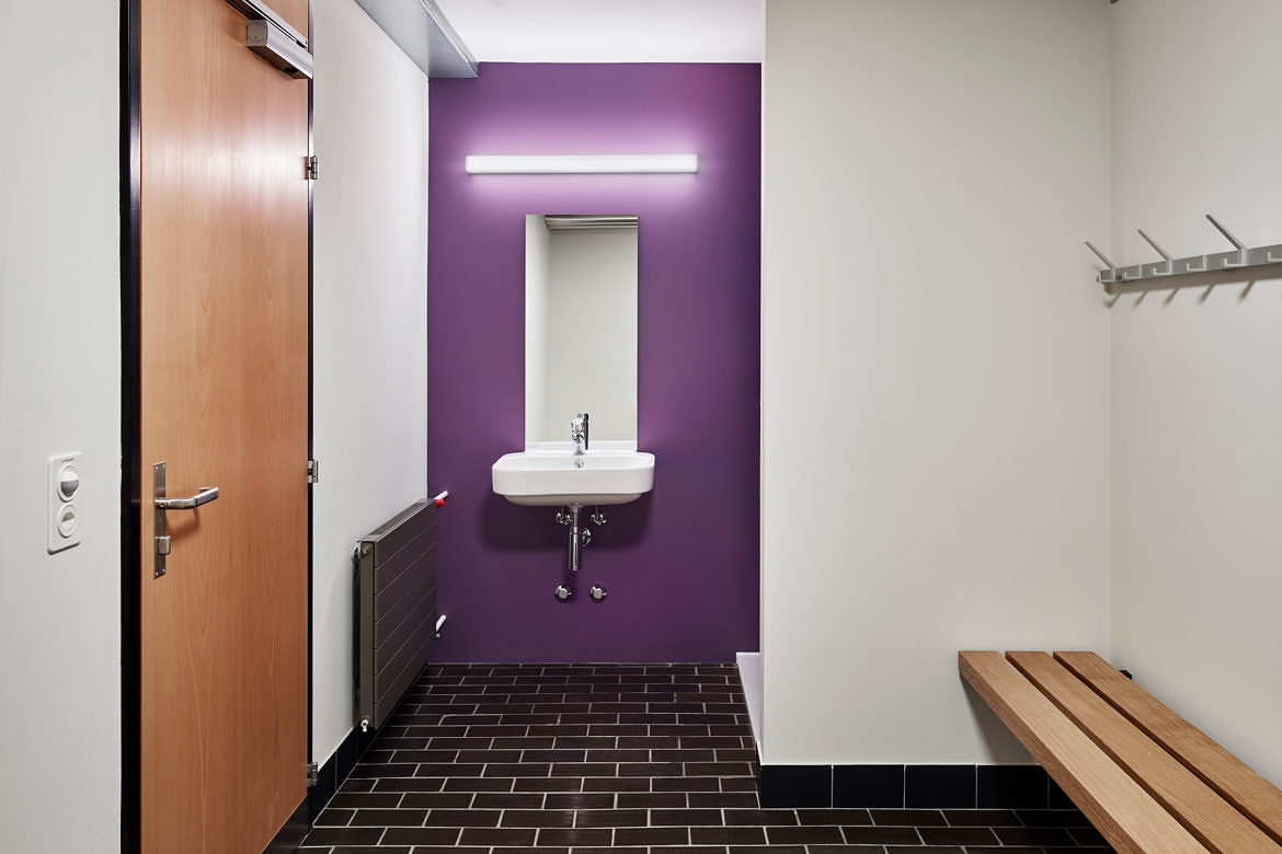 Innerhalb von nur zehn Wochen wird die Turnhalle Gäbelbach umfassend saniert. Die massvolle Sanierung bewahrt den Charakter des Baus aus den 1960er-Jahren. Einzig kräftige Farben im Dusch- und Garderobenbereich weichen vom Bestand ab, bilden mit diesem aber eine harmonische Einheit.