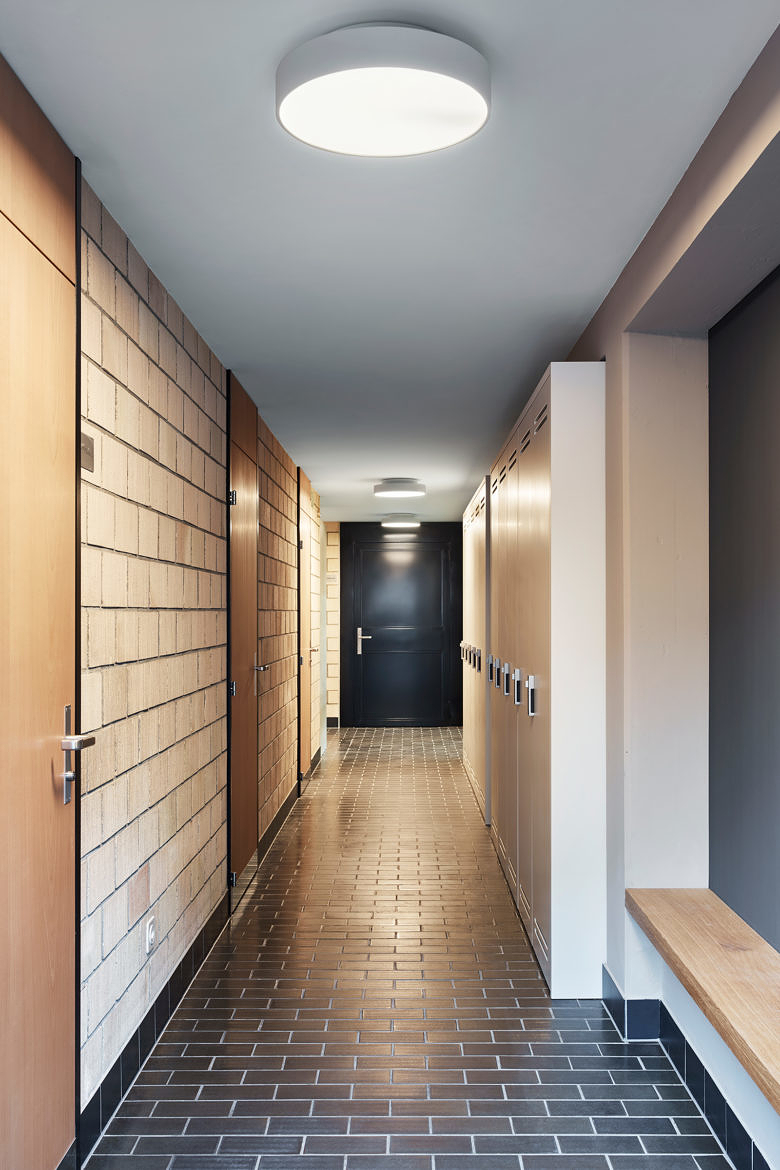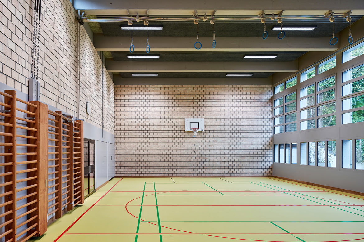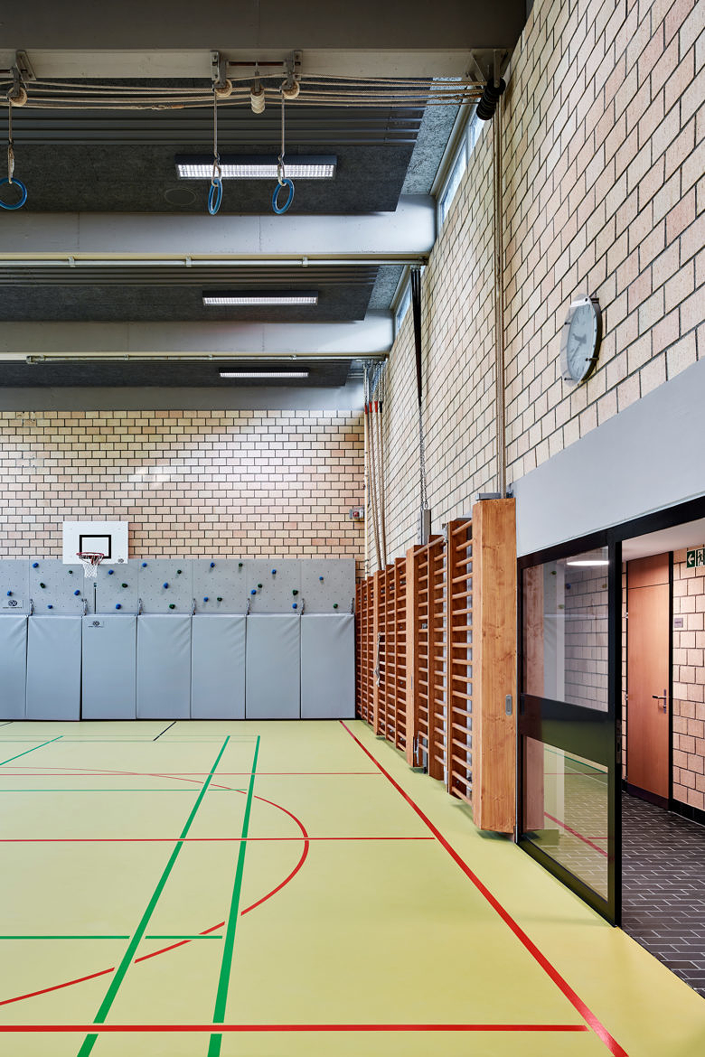 Die Fensterfronten sind energetisch saniert und die gesamte Haustechnikinstallation ist ersetzt. Ein neuer Hallenboden und eine neue Akustikdecke steigern den Nutzwert der Halle enorm. Einbauten und Oberflächen wurden wo möglich im Sinne einer ressourcenschonenden Sanierung erhalten. Die Materialisierung und Farbgebung übernimmt das ursprüngliche Konzept, einzig die neu erstellten Duschen und WC-Räume erhalten eine Akzentuierung in ihrer Farbigkeit.