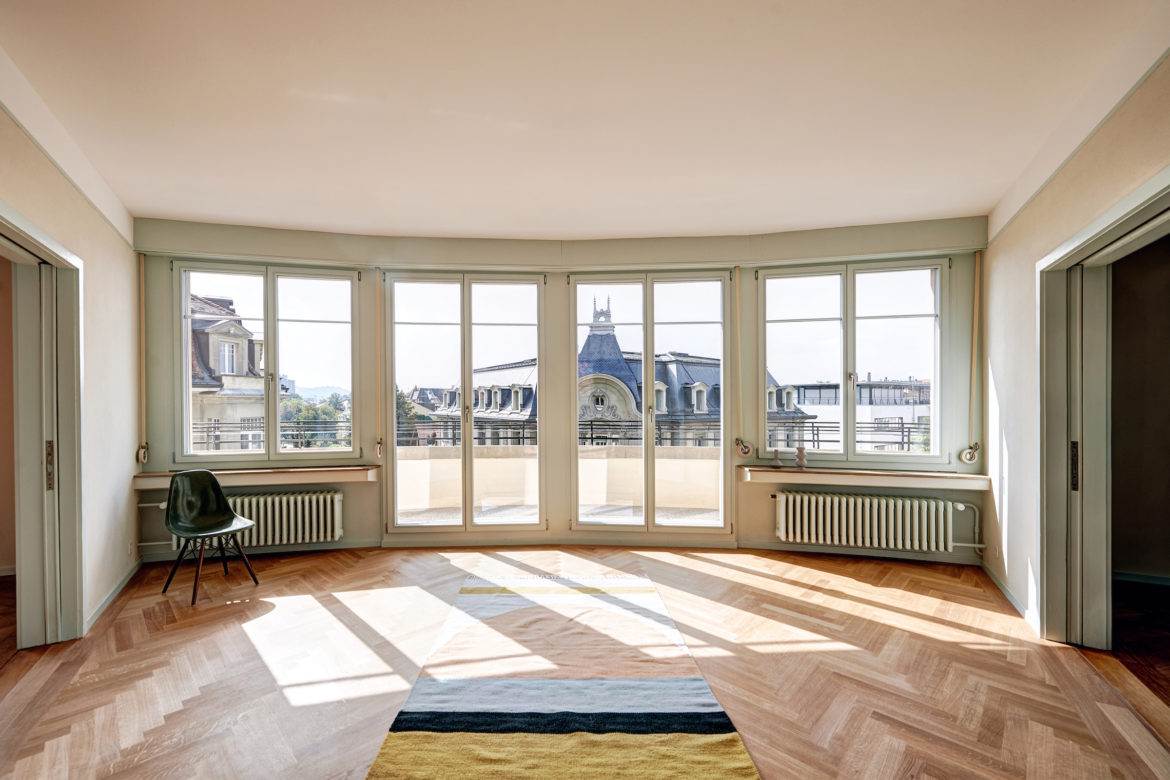 Kleine Details zeichnen den Umgang im Bestand aus – so wurde zum Beispiel die in der Schaufensterfront integrierte Ausstellstore im Gewerberaum repariert, fehlende Teile nachgebaut und der Antrieb wieder gangbar gemacht. Die wiedergewonnene Farbigkeit im Treppenhaus und in den Wohnungen, die feine farbliche Zäsur in den Wohnräumen, sowie die Wahl der keramischen Oberflächen folgen dem entwickelten Sanierungskonzept. Hofseitig erhalten die Wohnungen grössere Balkone, welche den Ausdruck des Gebäudes aufnehmen. Das Attikageschoss erfährt eine grundlegende Erneuerung. Das architektonische Konzept verfolgt eine klare Trennung zu den Regelgeschossen und bildet den neu gewonnenen Wohnraum formal als Neubau ab.
