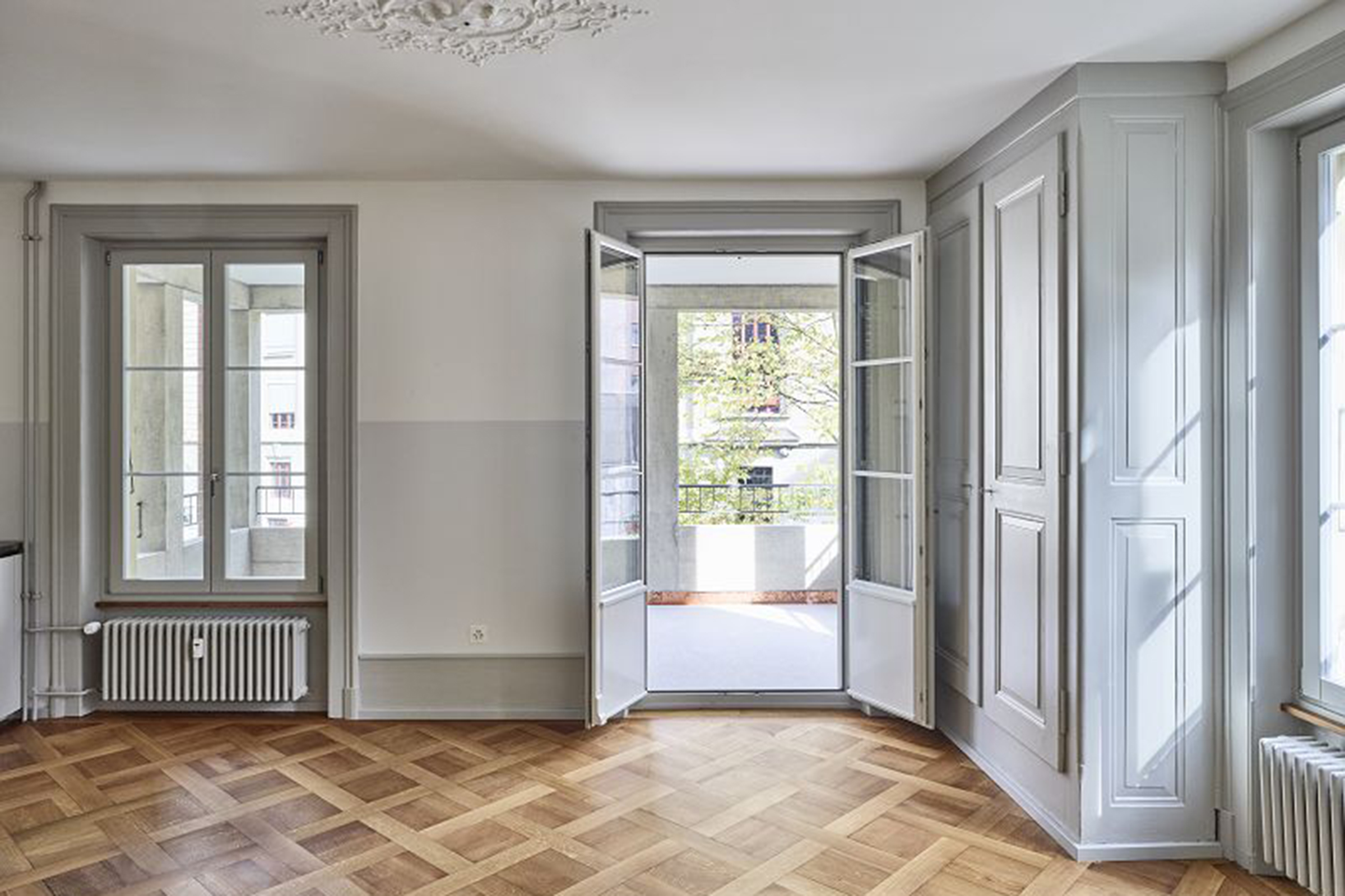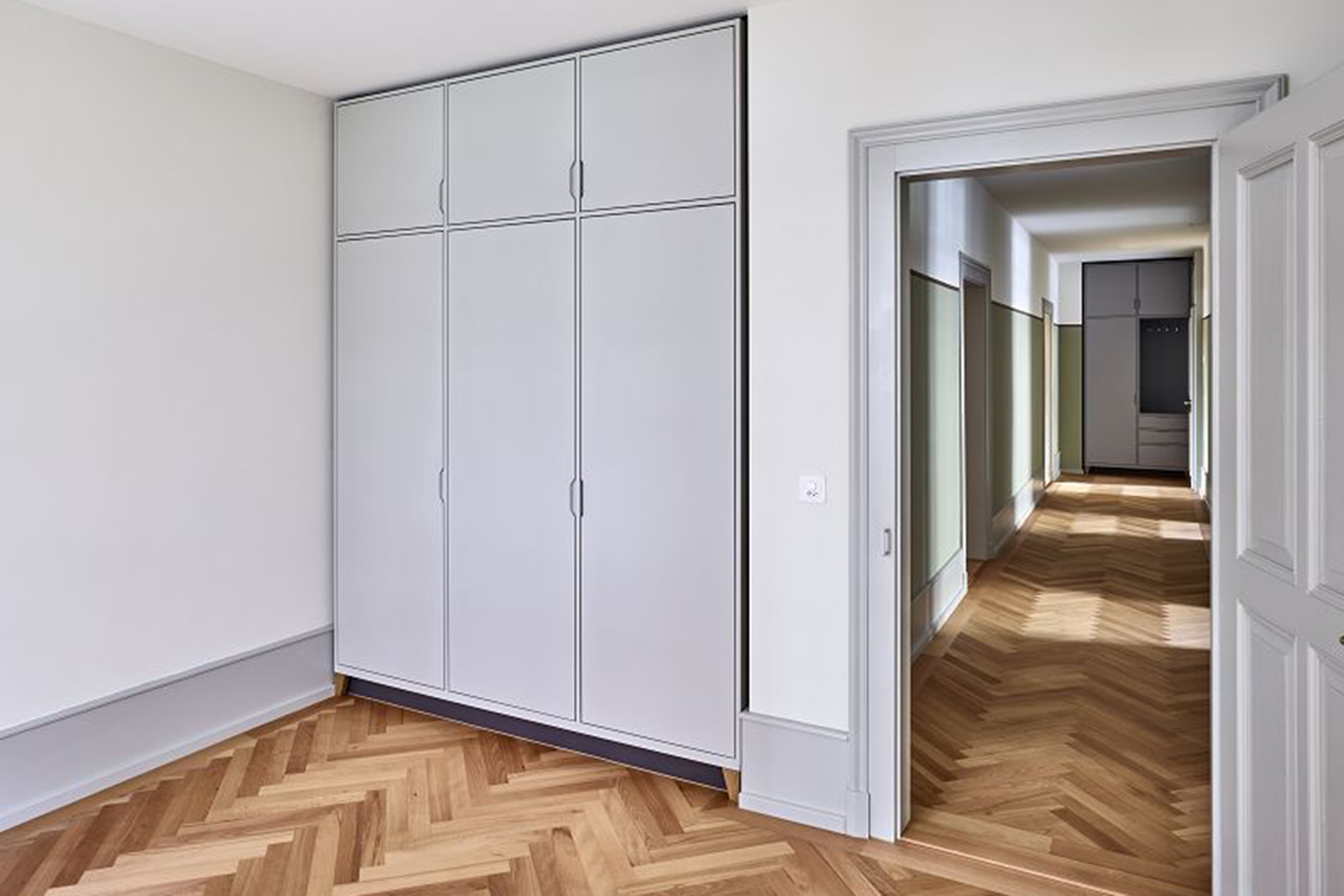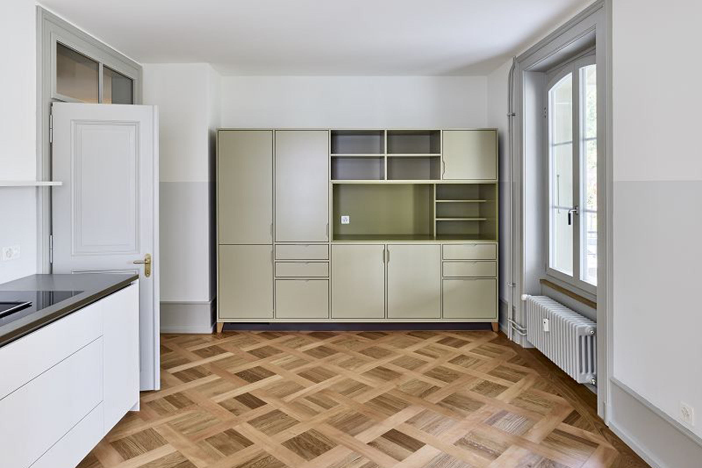 Verschiedene Holz- und Verlegearten von historischen und rekonstruierten Parkettböden und ein durchlaufender Fussladen führen zu einer atmosphärischen Raumstimmung. In Anlehnung an die teilweise vorgefundenen, sechseckigen Zementplatten wurde in den Nassräumen der neue Boden verlegt. Diverse Schichten von Tapeten zeugten wie Jahrringe von mehrfachen Sanierungen und wurden bis auf die Grundstruktur zurückgebaut. Hinter nachträglich eingebauten Schränken fanden wir aufschlussreiche Erkenntnisse zur ursprünglichen Farbigkeit. In Zusammenarbeit mit Denkmalpflege und Restaurator erstellten wir so ein durchgängiges Farbkonzept. Neue Einbauten reihen sich in diese Farbigkeit ein, heben sich aber durch ihre Gestaltung differenziert ab.