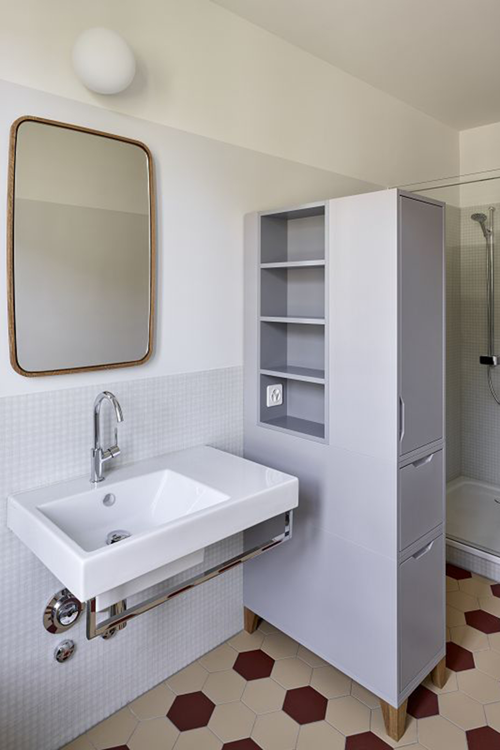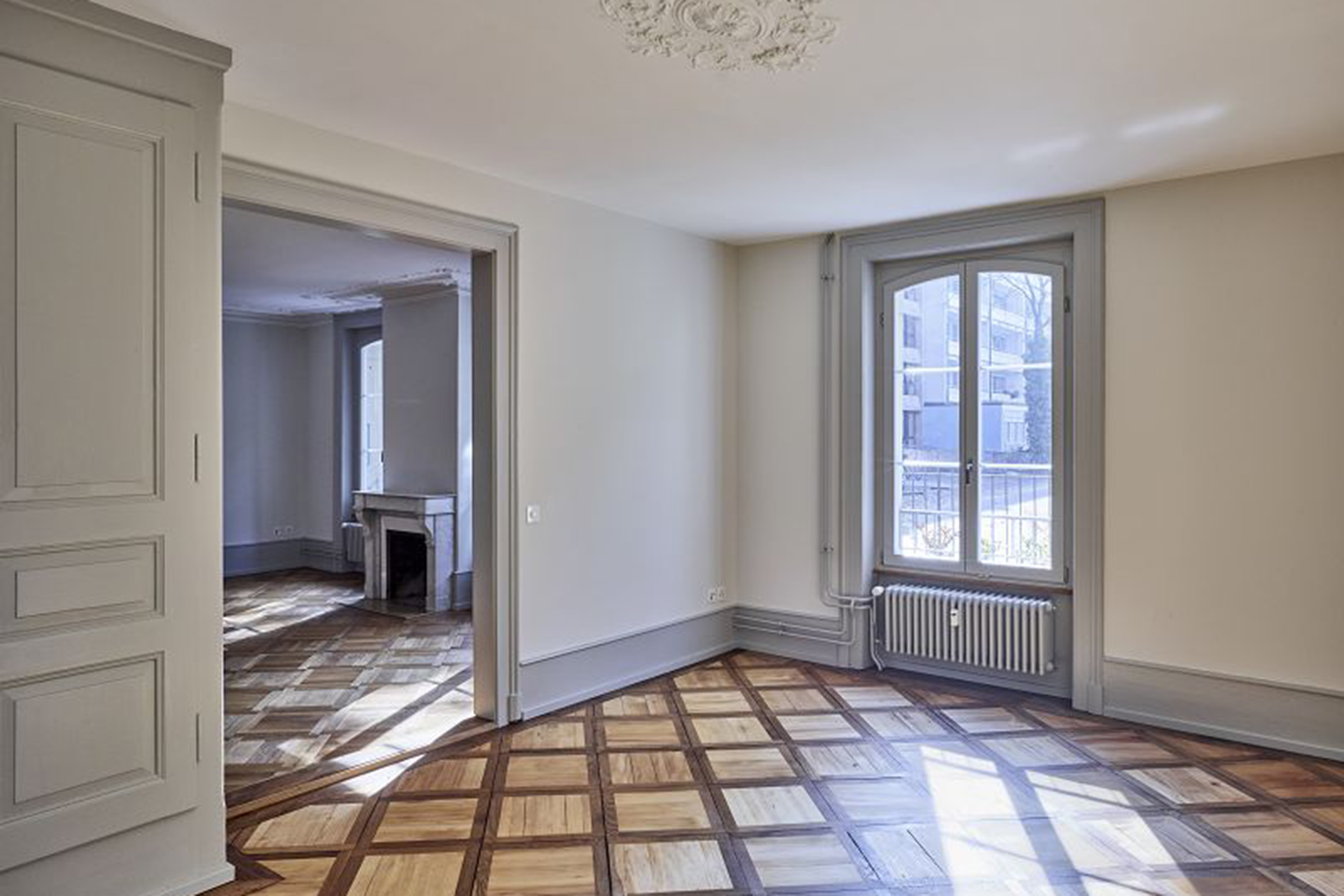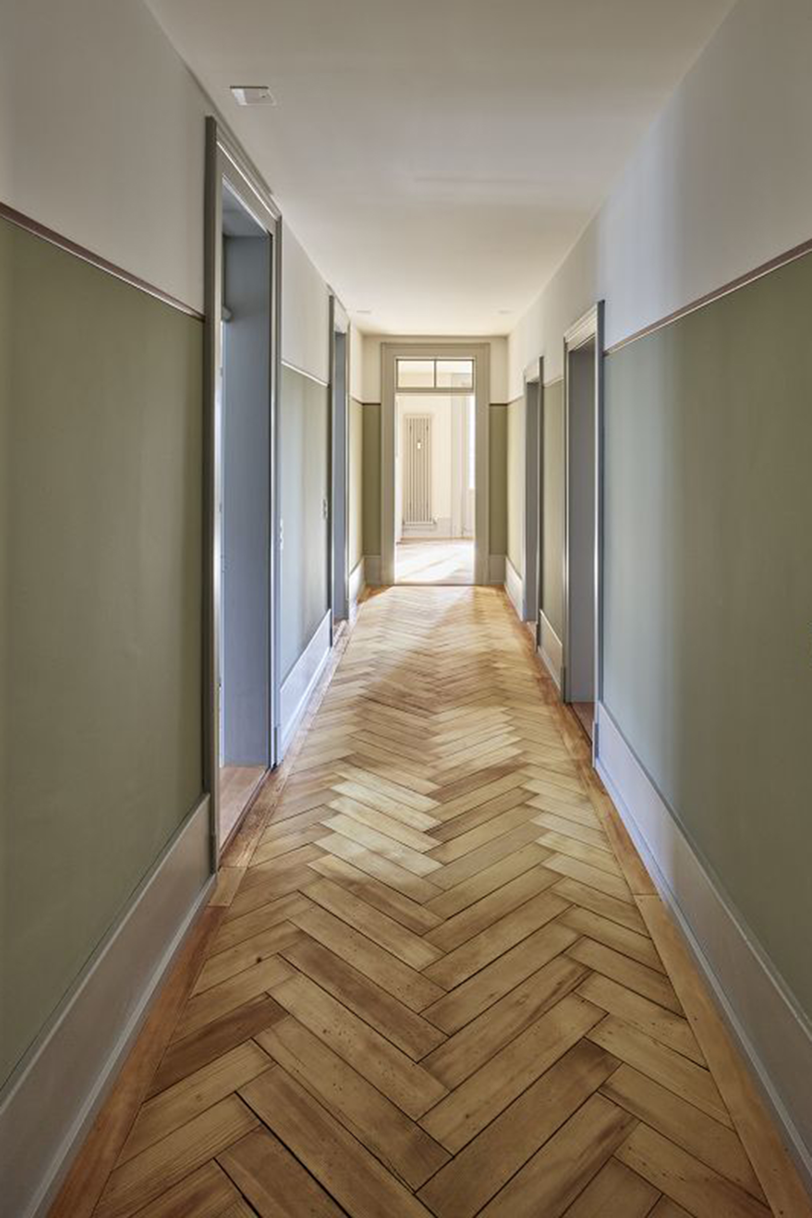 Verschiedene Holz- und Verlegearten von historischen und rekonstruierten Parkettböden und ein durchlaufender Fussladen führen zu einer atmosphärischen Raumstimmung. In Anlehnung an die teilweise vorgefundenen, sechseckigen Zementplatten wurde in den Nassräumen der neue Boden verlegt. Diverse Schichten von Tapeten zeugten wie Jahrringe von mehrfachen Sanierungen und wurden bis auf die Grundstruktur zurückgebaut. Hinter nachträglich eingebauten Schränken fanden wir aufschlussreiche Erkenntnisse zur ursprünglichen Farbigkeit. In Zusammenarbeit mit Denkmalpflege und Restaurator erstellten wir so ein durchgängiges Farbkonzept. Neue Einbauten reihen sich in diese Farbigkeit ein, heben sich aber durch ihre Gestaltung differenziert ab.