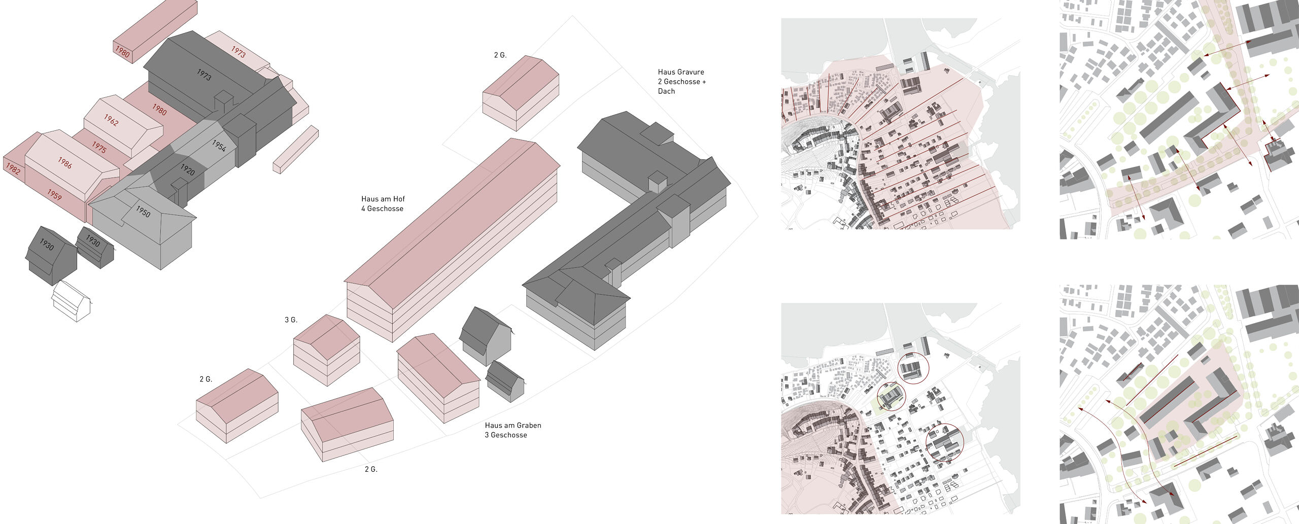 Das Gravure Areal liegt am Strandboden, am Fuss der historischen Altstadt. Im Gegensatz zu der geschlossenen Bauweise der historischen Strukturen zeichnet sich der Strandboden durch ein offenes Bebauungsmuster aus. Neben den einzelnen freistehende Volumen prägen grössere Baugruppen mit gewerblicher Vergangenheit das Stimmungsbild dieser durchlässigen Siedlungsebene. Das Areal behält sein Gewicht und seine Eigenständigkeit auf dem offen bebauten Strandboden und trennt sich typologisch von der Altstadt ab. Die ortsprägende radiale Bebauungsstruktur wird übernommen.