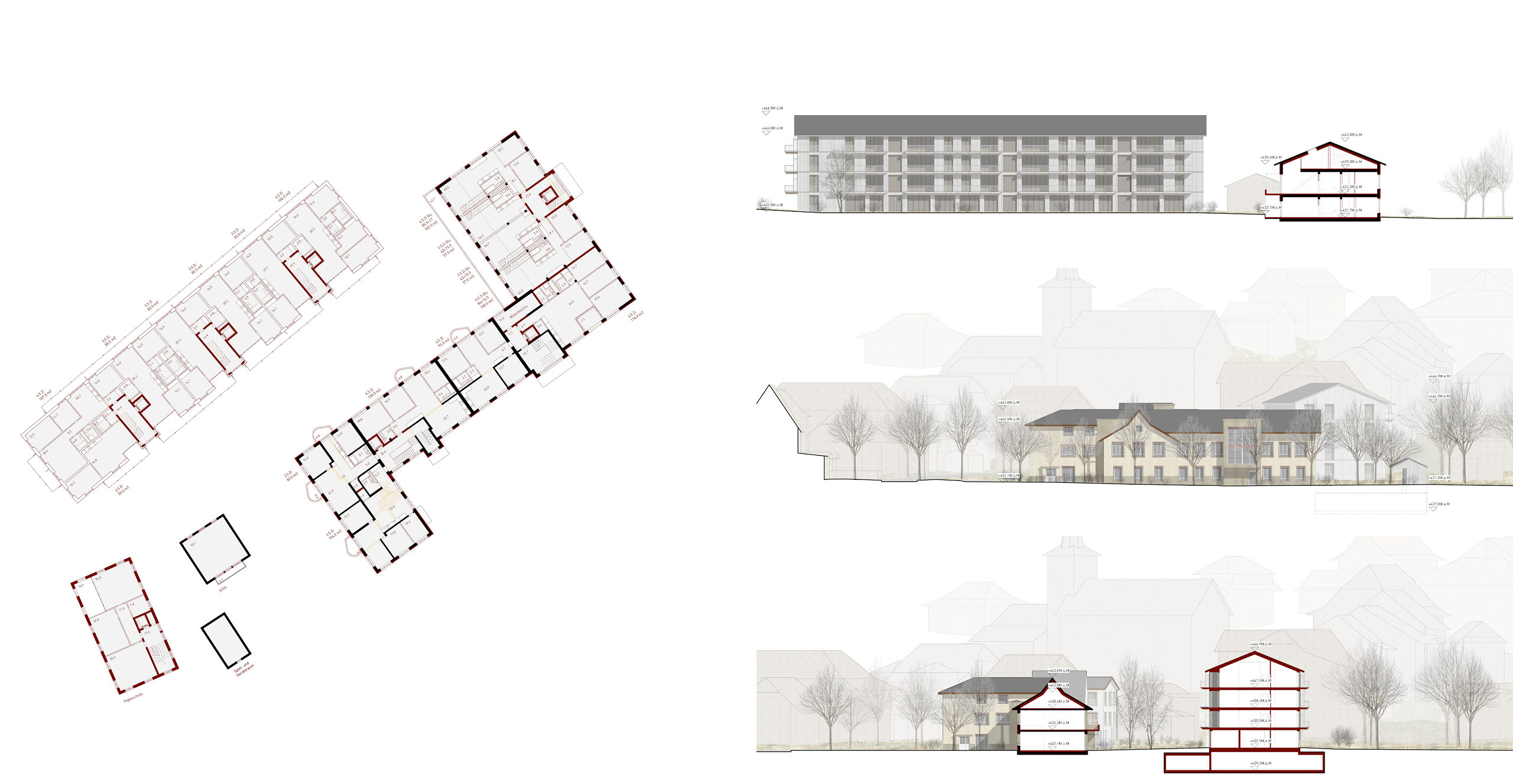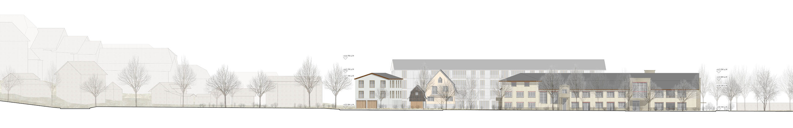 Nebens Raum für eine Kita, eine Tagesstruktur und ein Gemeinschaftsraum werden insgesamt 46 Wohnungen angeboten. 28 davon sind im neu gebauten Hofgebäude verortet, die weiteren 18 Wohnungen im umgenutzten Fabrikgebäude. Die Gebäude erhalten differenzierte Adressierungen: Der Neubau und die alte Villa werden über den Grünraum adressiert, die Gravure bekommt ihre Adresse vom Stadtgraben. Den Übergangsräumen wird dabei besondere Aufmerksamkeit geschenkt.