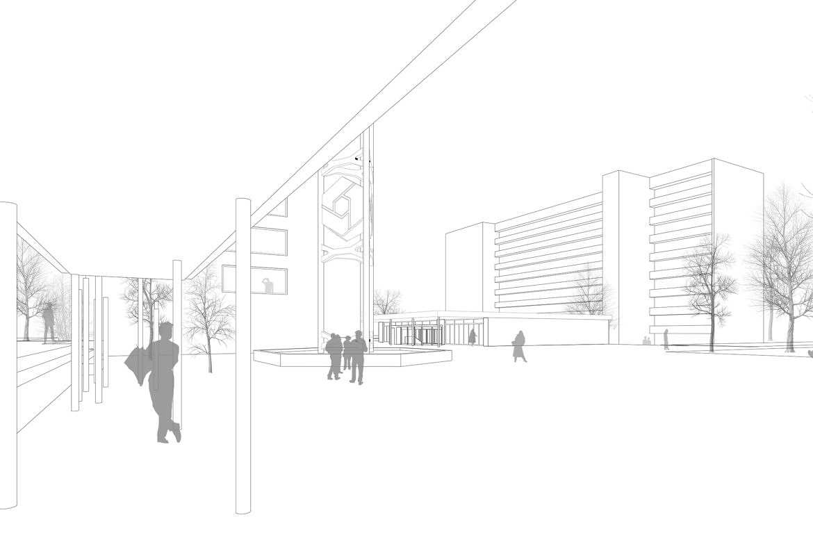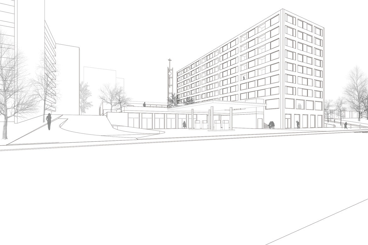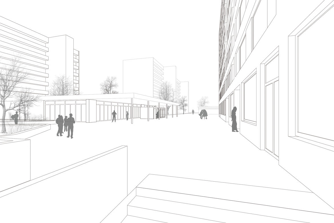Das Neubauvolumen richtet sich dreiseitig, in Ost-, West- und Südrichtung aus. Gegen den Platz bildet eine grösstenteils geschlossene Fassade analog den bestehenden Scheibenhäusern den Abschluss, zur Fellerstrasse wird in Anlehnung an die Kopfbauten der Scheibenhäuser adressbildend eine Stirnfassade mit Verkaufsnutzung im Sockelgeschoss ausgebildet.
