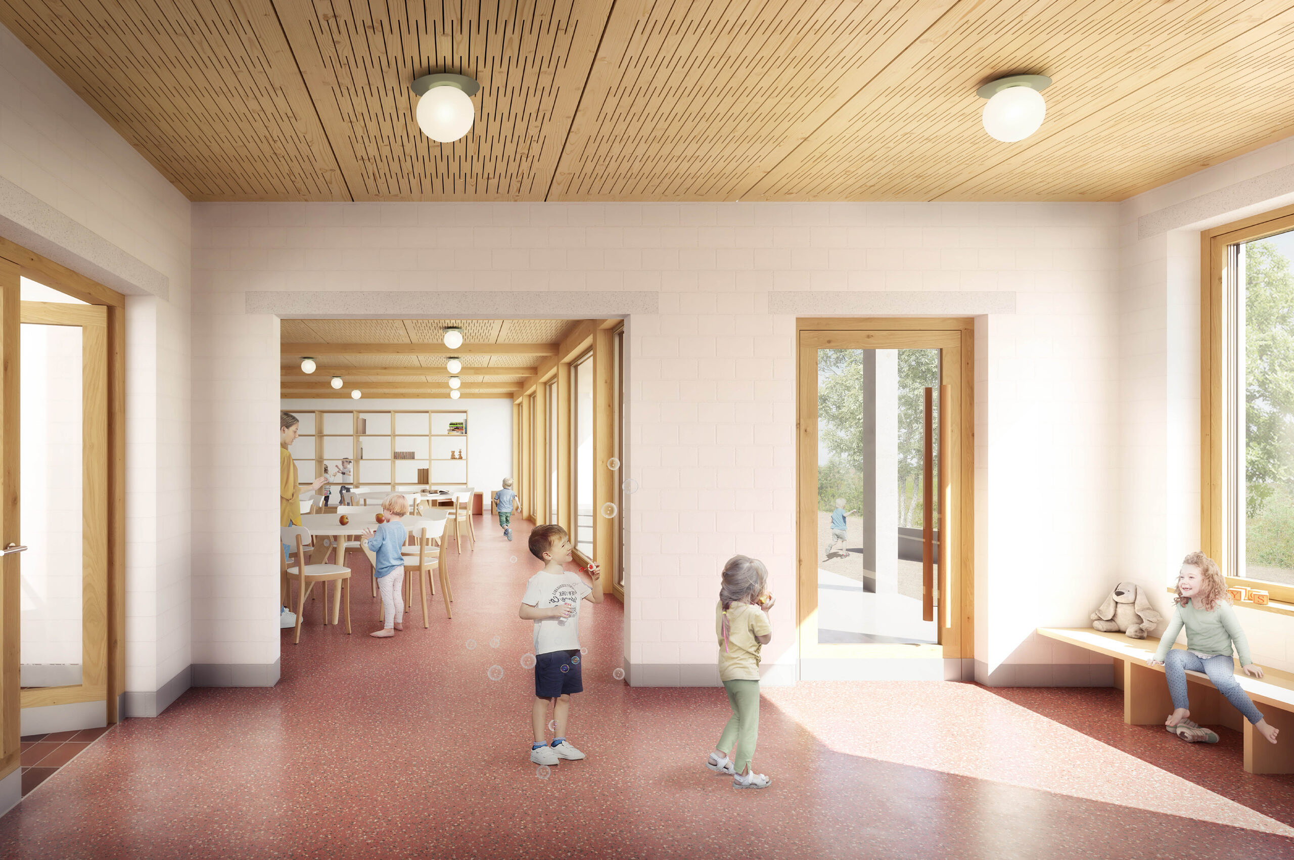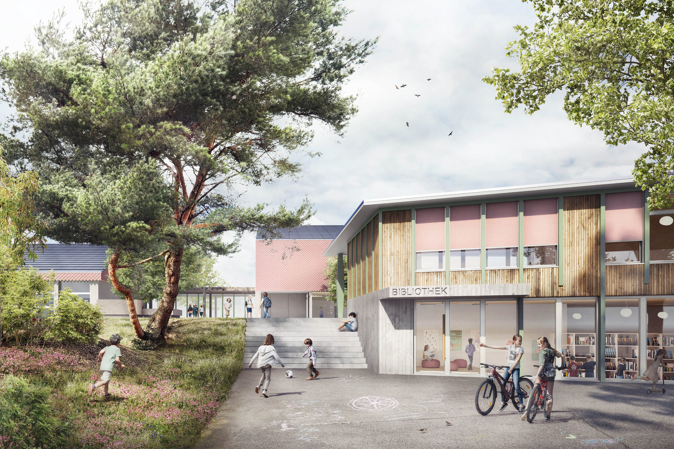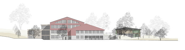 Mit dem Neubau eines Kulturpavillons mit Bibliothek und Musik-/Mehrzweckraum wird die Schulanlage näher zum Dorf gerückt, sie wird öffentlicher und sichtbarer. Der Neubau empfängt die Besucherinnen und Besucher der Schulanlage und begleitet sie auf das Niveau des Pausenplatzes. Der Hauptzugang zur Anlage über den Pausenplatz wird zusätzlich gestärkt.