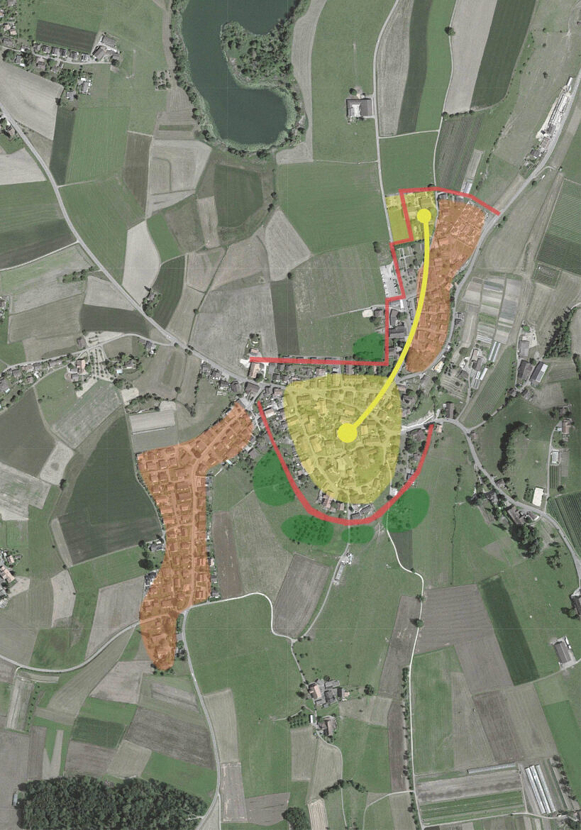 Der Kulturpavillon bildet die neue Eröffnungs-Spielfigur zur Schulanlage. Er zeichnet sich durch seine Öffentlichkeit aus und schafft eine neue Identität, bindet aber gleichzeitig den Bestand mit ein. Seine fünfeckige Form unterstreicht dessen Sonderstellung. Er knüpft an die dörfliche Struktur an und adressiert die Schule Zelg neu am namensgebenden Weg.