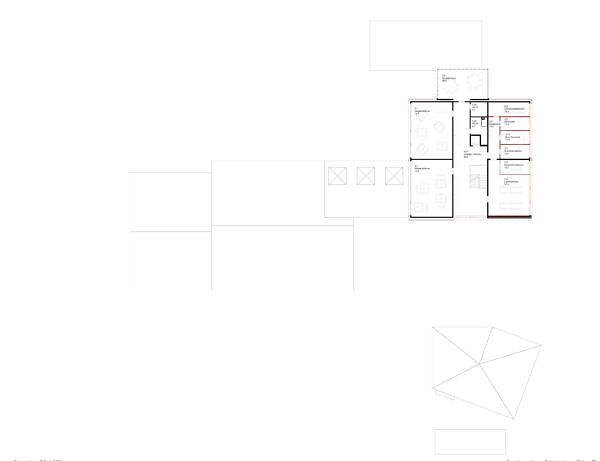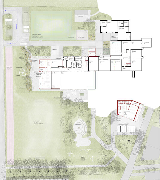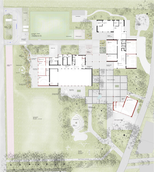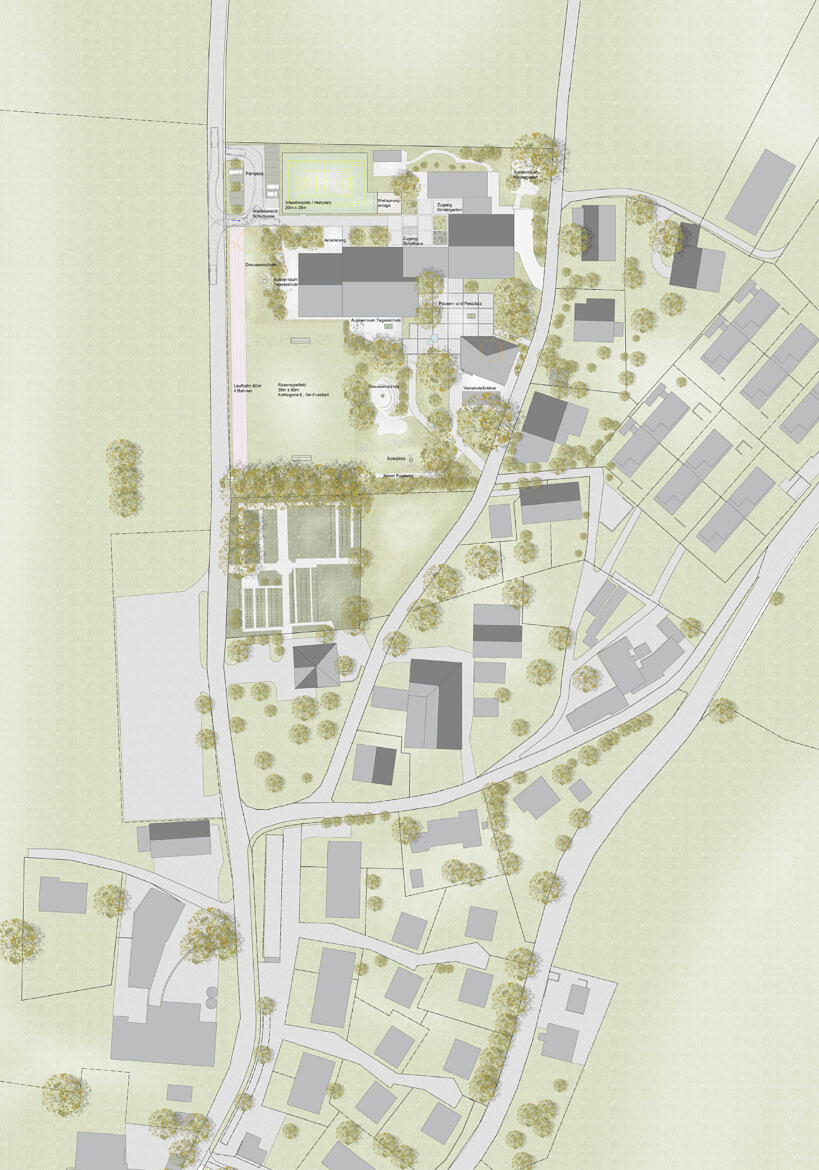 Unser Ansatz sieht drei Interventionen vor: den Kulturpavillon als Neubau, der Anbau beim Turnhallentrakt und der Ausbau des Dachgeschosses vom Hauptgebäude. Diese Haltung baut auf die bestehenden Aussenraumqualitäten auf und stärkt die Verbindung zum Dorf.