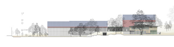Die Mehrzweckhalle wird gegen Westen um rund acht Meter erweitert. Der Hauptzugang zur Mehrzweckhalle befindet sich weiterhin vom Pausenplatz her. Auf diesem Niveau sind Schulküche und Bandraum untergebracht. Ein neuer Lift direkt beim Eingang verbindet die beiden Geschosse der Mehrzweckhalle. Er kann aber auch als hindernisfreie Verbindung vom Pausenplatzniveau zum nördlichen Aussenraum genutzt werden.
