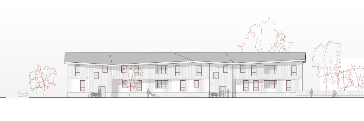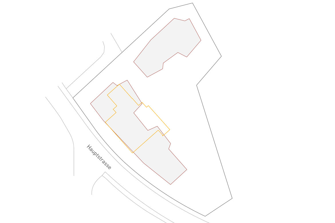 Die historischen Gebäude in Matten reihen sich entlang der Hauptstrasse auf, sie stehen direkt an der Strassenkante und sind verantwortlich für den prägenden Charakter des Strassenraumes. Der Projektvorschlag übernimmt die ortsbauliche Typologie und besetzt die Strassenflucht. Die Strassenfassade des Westhauses verläuft parallel zur Hauptstrasse. Um dies zu ermöglichen, ist sie an drei Punkten leicht geknickt. Die geknickten Baukörper generieren differenzierte Fassadenflächen, die in der Proportion den historischen Bauten entsprechen. Die bestehende Traufhöhe der älteren Nachbarbauten kann weitergeführt werden.