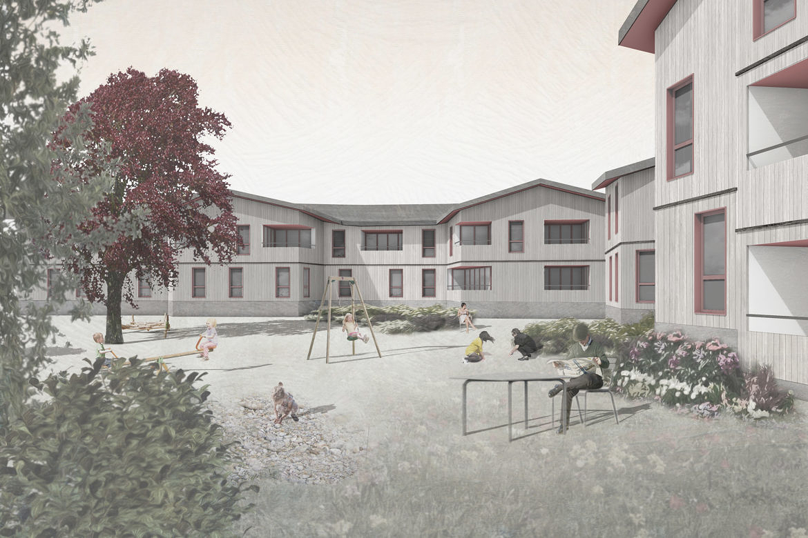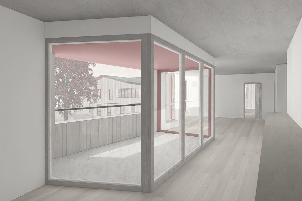 Der grosszügige Aussenraum ermöglicht Rückzugsmöglichkeiten und Begegnungszonen für alle Generationen. Der Wohn- und Essbereich spannt sich jeweils von der Strasse bis hin zum Garten, jede Wohnung erhält dadurch einen starken Bezug zur grünen Parklandschaft. An den offenen Wohn- und Essräumen sind Loggien angelagert, die den Bezug zum Garten noch verstärken. Es ist ein vielfältiger Wohnungsmix vorgesehen: die Spannweite reicht von der kleinen 1½-Zimmer-Wohnungen bis hin zur grossen 5½-Zimmer-Wohnung für Familien. Das Raumangebot ermögliche eine vielfältige Möblierbarkeit und differenzierte Wohnbereiche mit spannenden Sichtbeziehungen.
