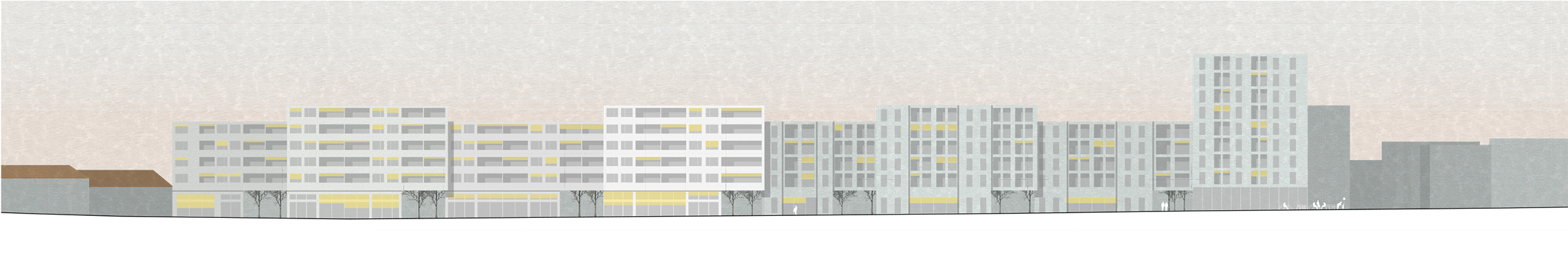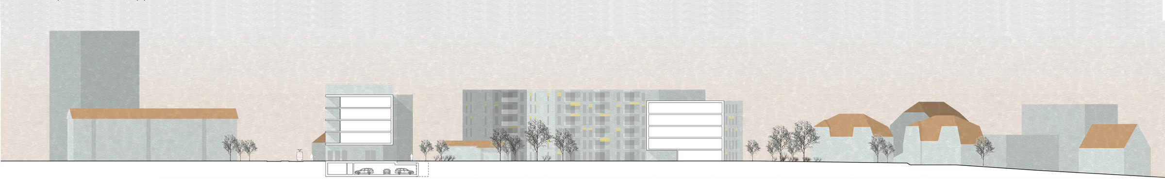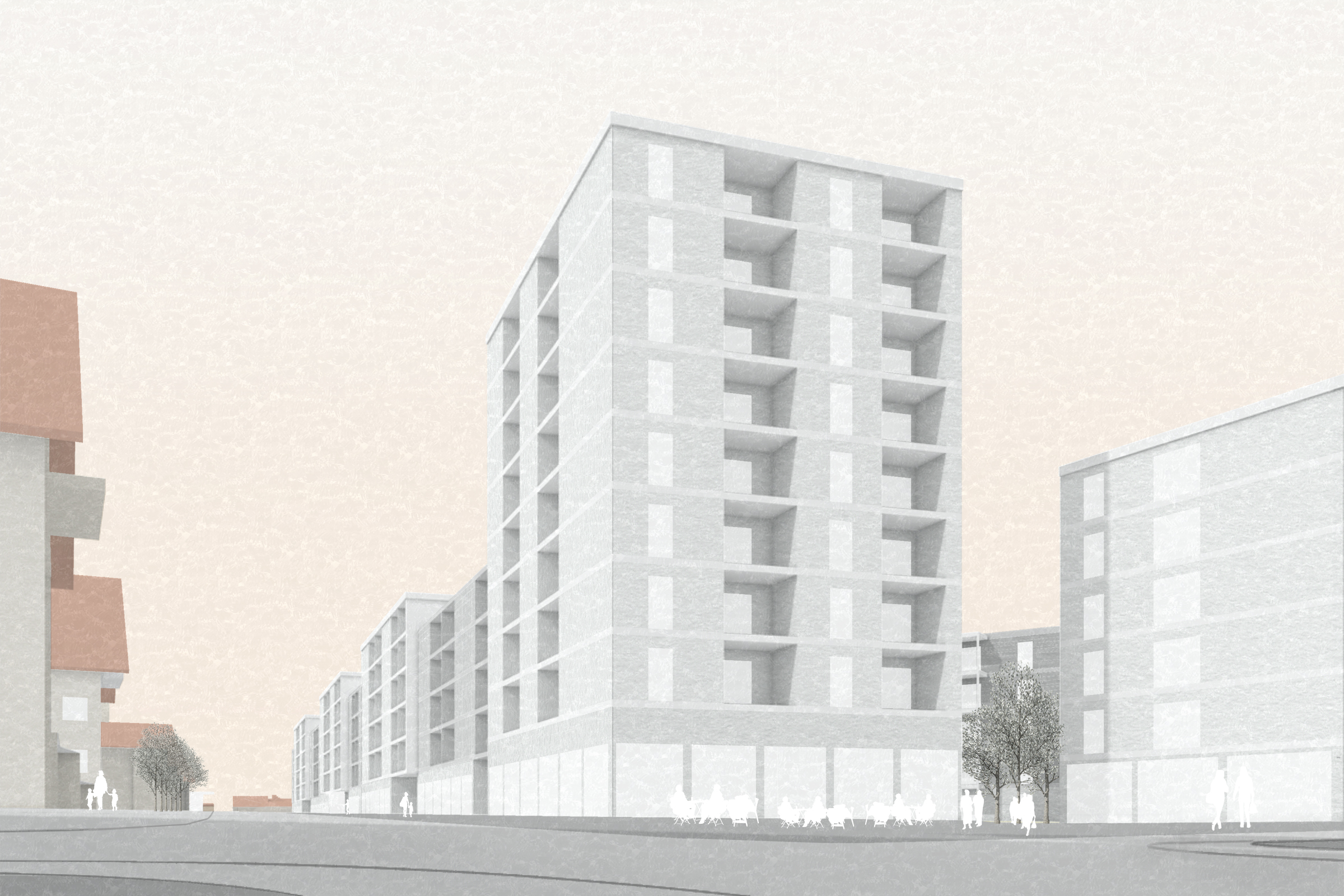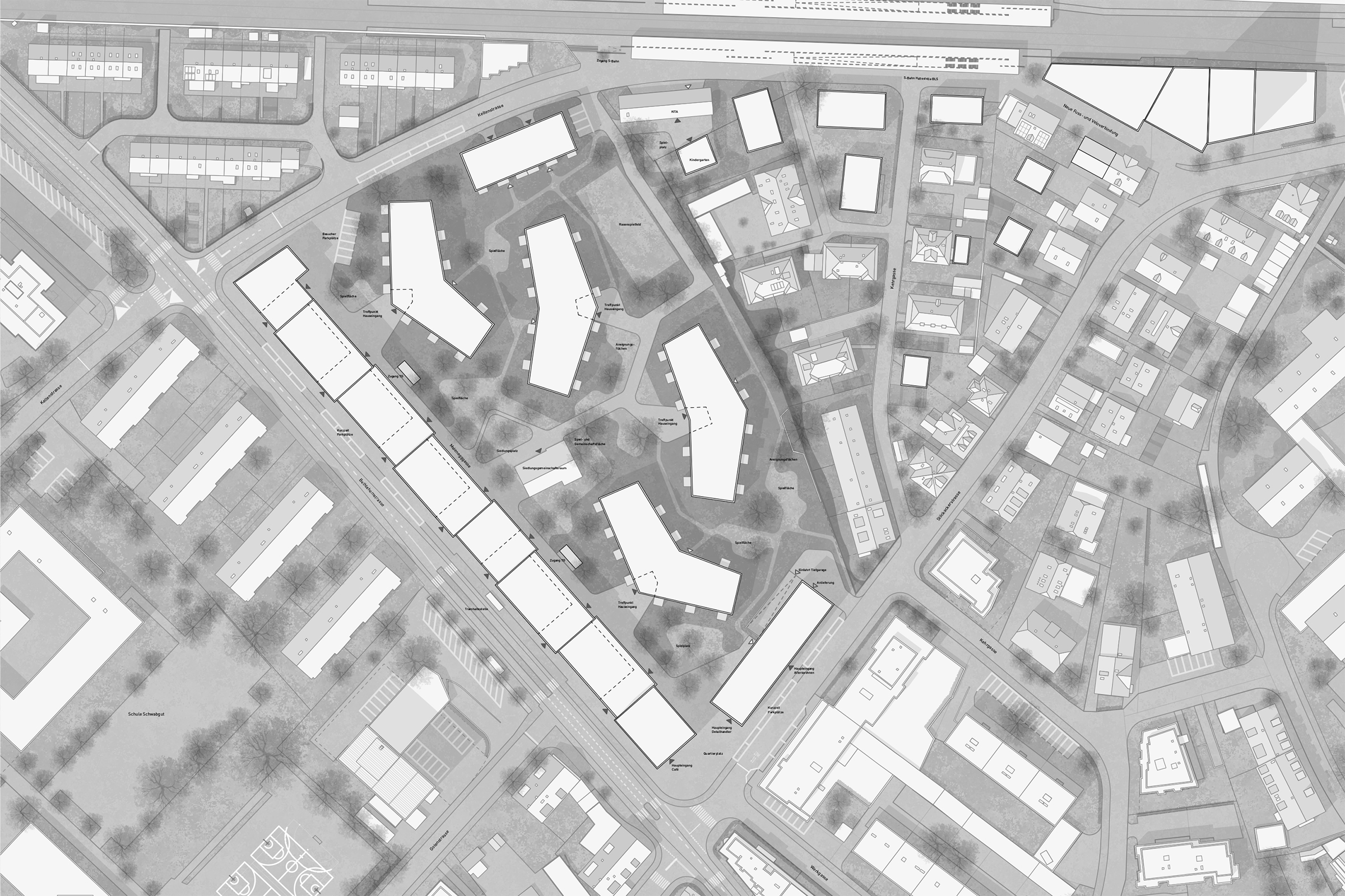Die Bethlehemstrasse hat urbanes Potential, welches die Überbauung Meienegg heute nicht einlösen kann. Eine städtebauliche Verdichtung findet ihren Höhepunkt beim neuen Quartierplatz. Ein Neubauvolumen an der Stöckackerstrasse prägt mit seiner Höhe und Länge den Strassenraum und schafft mit seinem bereits bestehenden Gegenüber eine räumliche Verdichtung.