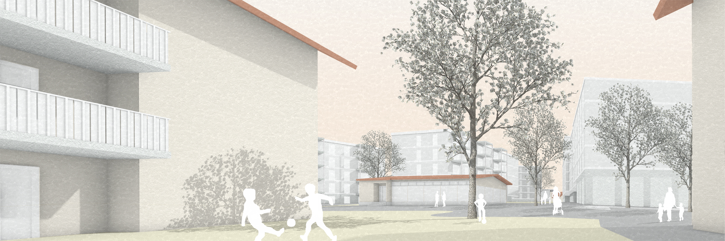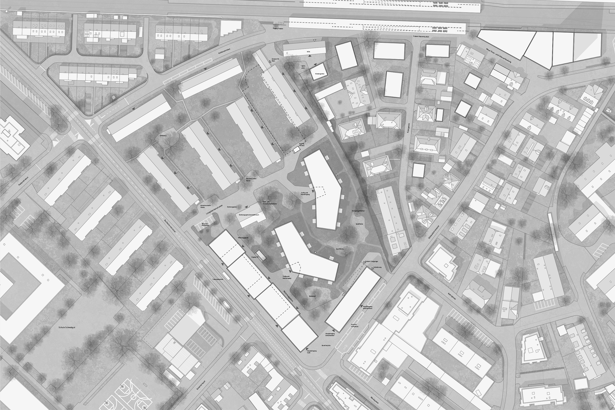Eine andere Situation finden wir am östlichen Rand der Siedlung vor: Der vorhandene Privatweg ist unattraktiv und abweisend und wirkt als starke (grün-)räumliche Kluft. Künftig erobert sich der Grünraum den Strassenraum zurück und fügt die neue Meienegg mit dem durchgrünten, gewachsenen Quartier zusammen. Die Keltenstrasse schliesslich ist heute wenig quartierprägend. Der zukünftig neu gestaltete Bahnhof Stöckacker fördert aber die weitere Entwicklung. Zusätzlich wird der gegenüberliegende Atelierbau von Hans und Gret Reinhard zu einer Kita und Ateliers umgenutzt und belebt den Ort zu unterschiedlichen Zeiten. Zusammen mit einem zweigeschossigen Neubau eines Kindergarten-Pavillons entsteht im Übergang von der Meienegg zum Bahnhof Stöckacker ein neuer Knotenpunkt.