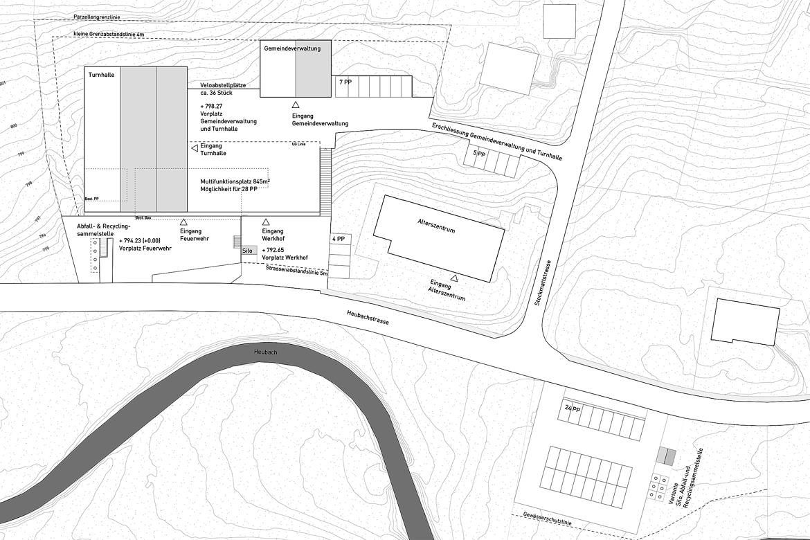 Die gewählte Typologie und die Trennung der Nutzungen ergeben ein folgerichtiges Erschliessungskonzept: Direkt ab der Kantonsstrasse sind die Feuerwehr und der Werkhof über einen Vorplatz erschlossen. Bei Veranstaltungen in der Mehrzweckhalle steht dieser als zusätzliche Parkierungsmöglichkeit zur Verfügung, erschlossen mit einem direkten Treppenaufgang zum Gemeindeplatz. Der Zugang zur Mehrzweckhalle und zur Gemeindeverwaltung erfolgt über die östlich gelegene Strasse. Für Autos und Fahrräder sind Abstellplätze direkt neben der Gemeindeverwaltung und der Mehrzweckhalle vorgesehen. Der Gemeindeplatz ist sowohl Veranstaltungs- als auch Parkplatz und bietet ein hohes Mass an Flexibilität. Er schliesst direkt an die Neubauten an, die restliche Umgebungsgestaltung folgt als Wiese dem gewachsenen Terrain.